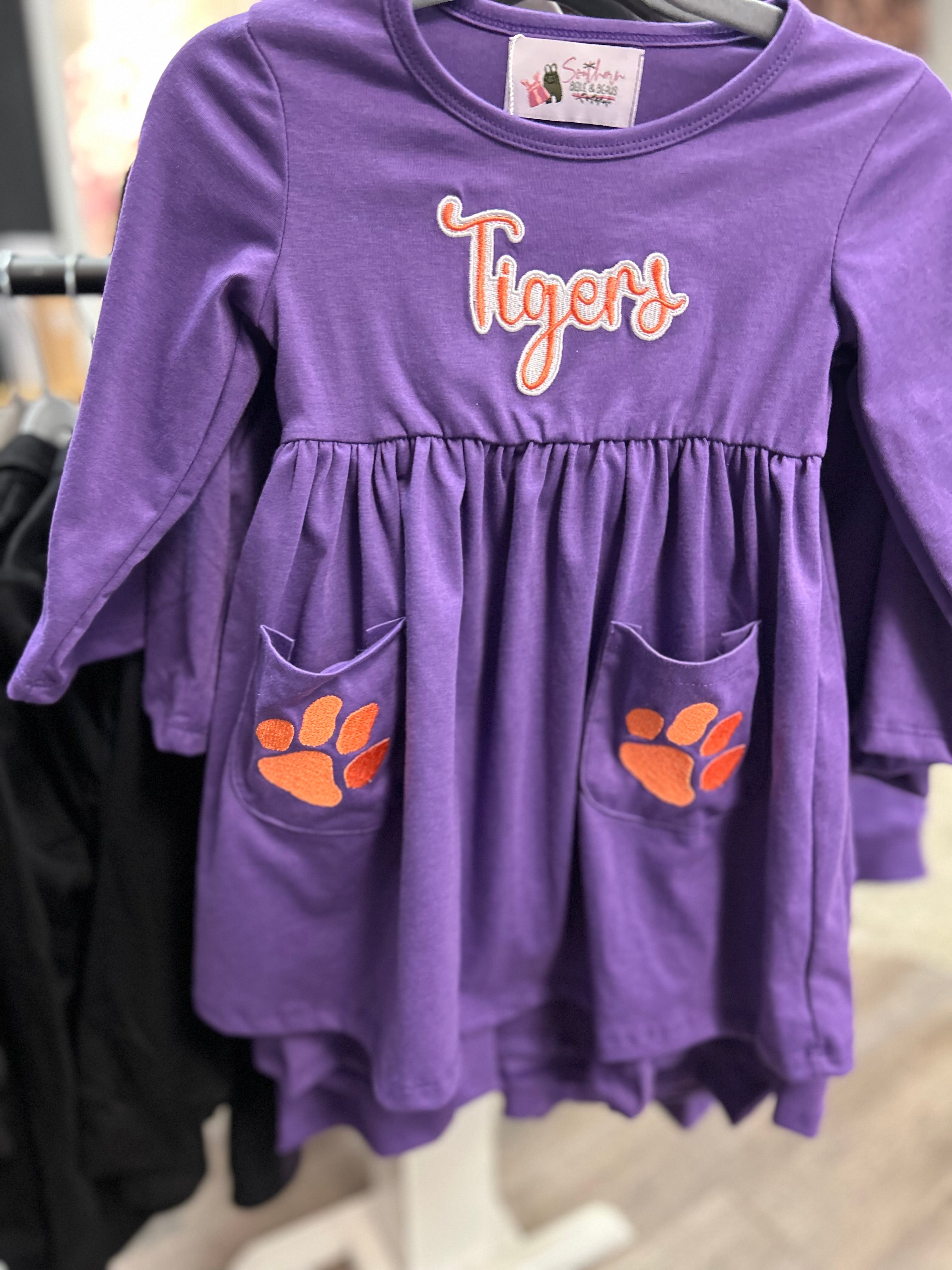 Get ready to show off your Clemson pride with our Clemson Girl Dress! This beautiful long sleeve purple knit dress features orange embroidery of the iconic Clemson paws on the front pockets. Stay warm and stylish while representing your favorite team. Go Tigers!