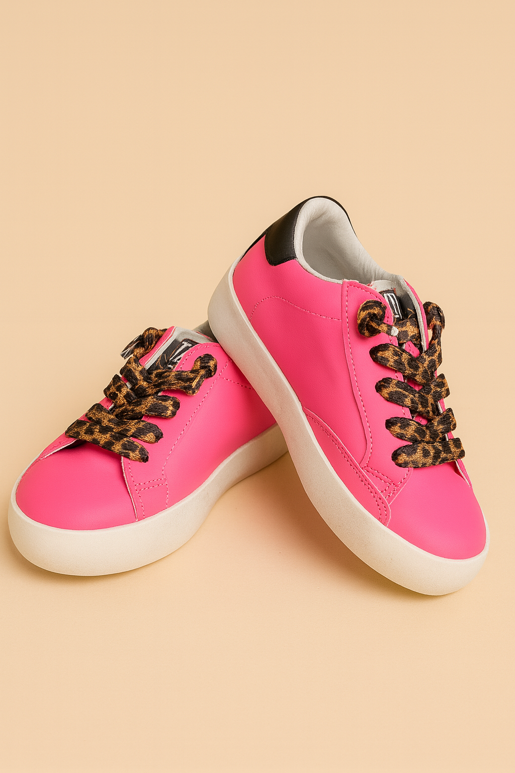 Meet the Hot Pink Wild Star Sneakers — the bold, glittery, leopard-laced shoes your girl will immediately fall in love with. These bright hot pink sneakers bring all the fun with a silver glitter star, contrast heel detail, and trendy leopard print laces. Comfortable, durable, and absolutely adorable for everyday play, school, or matching with her favorite SBB outfits.