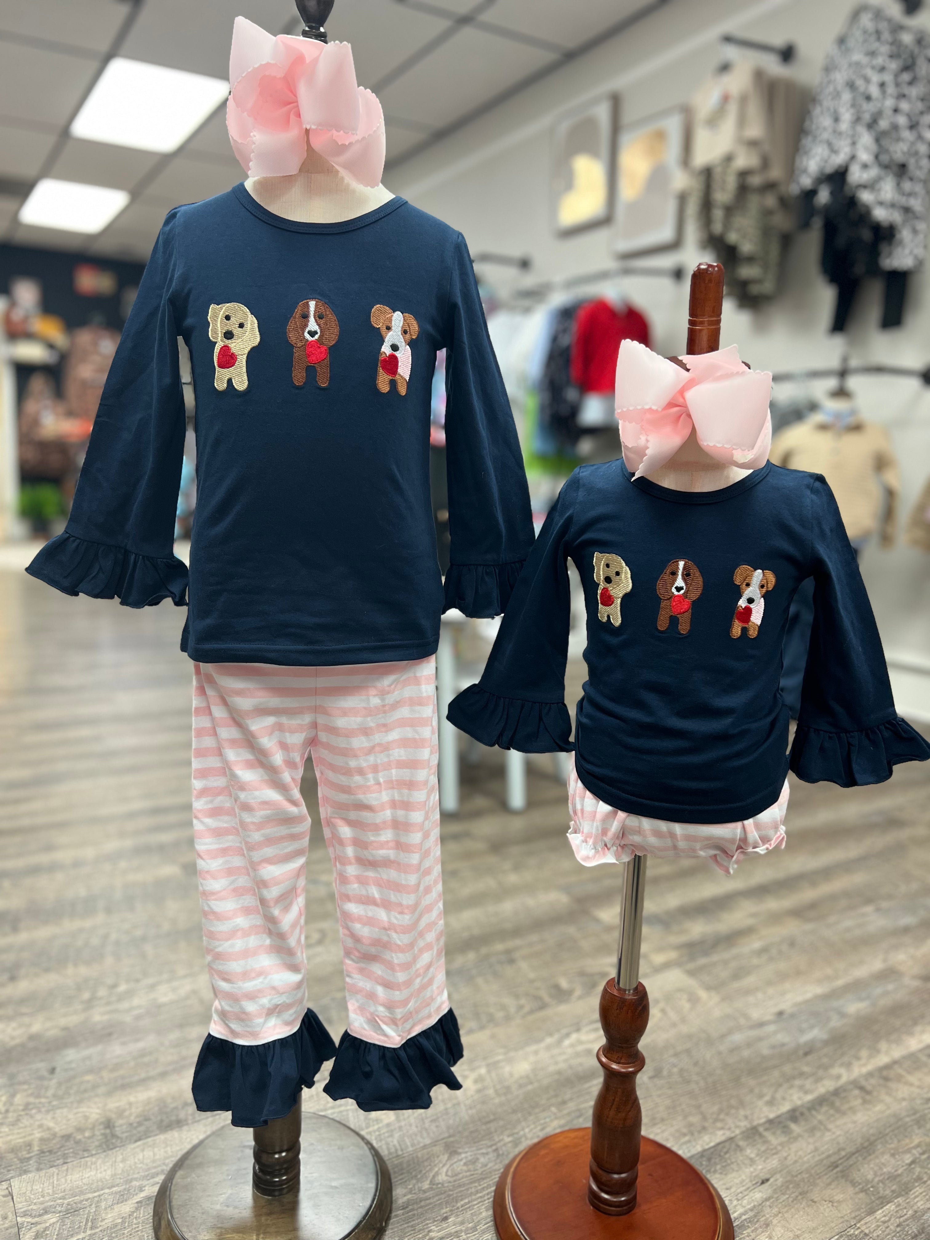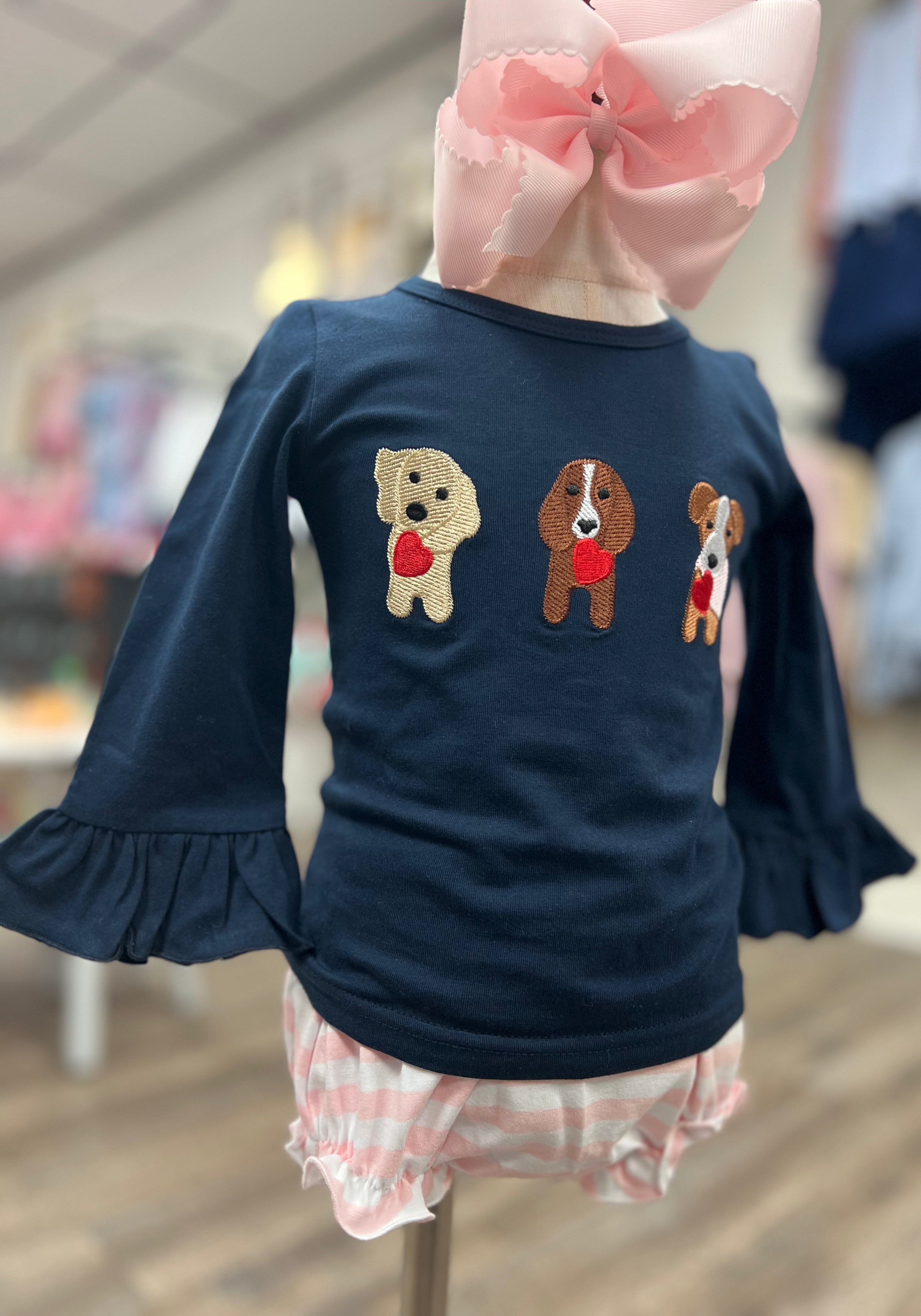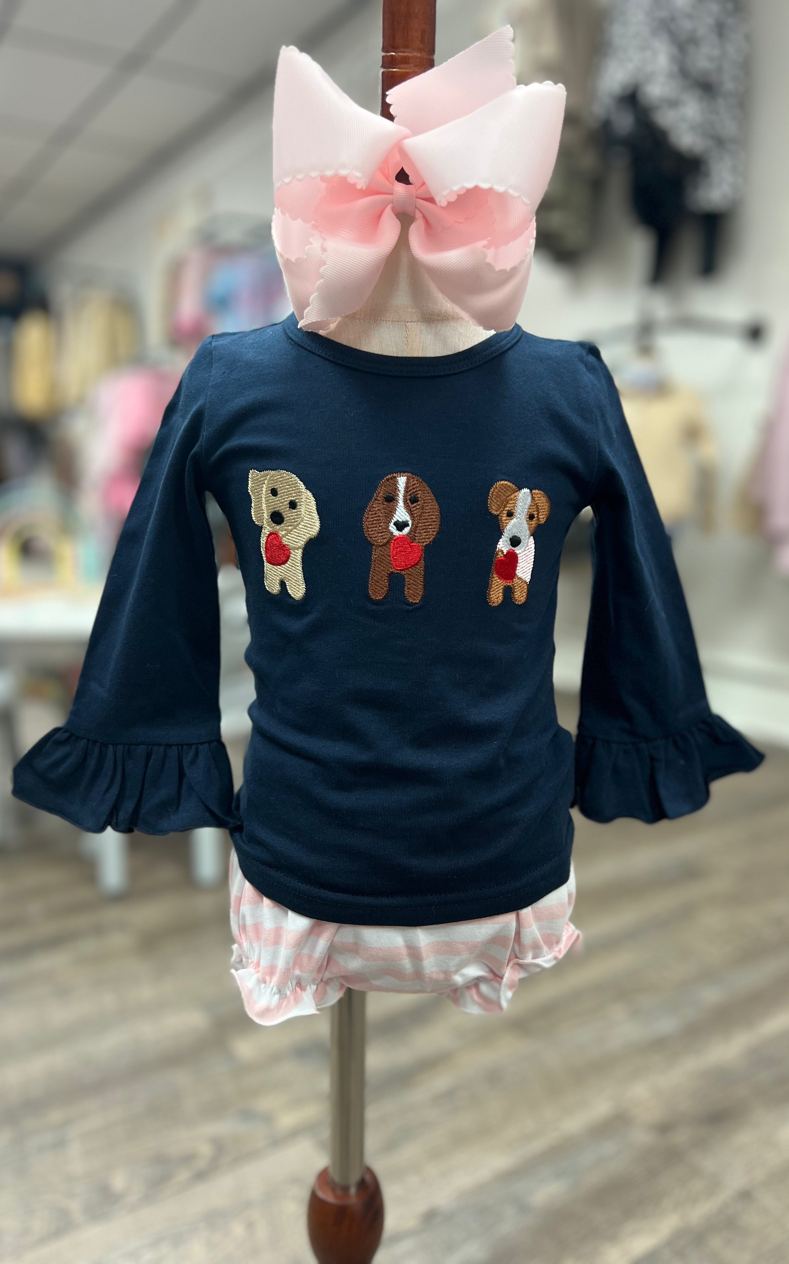 Dress your little girl in this adorable "I Woof You FurEver" diaper set! This charming set features a long sleeve knit navy top, complete with 3 puppies with hearts applique. The matching pink and white striped diaper bottom adds a touch of cuteness to this already sweet outfit. Perfect for any fun-loving pup-loving baby!