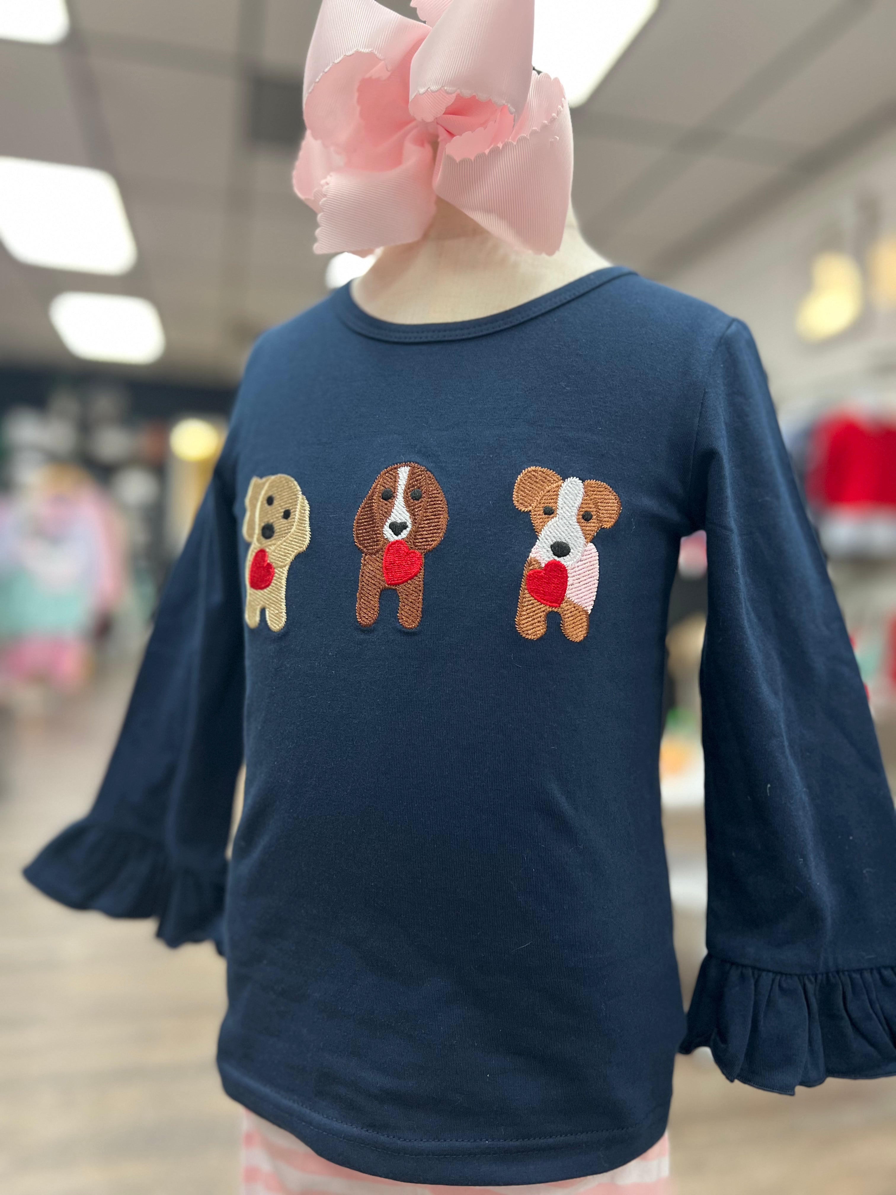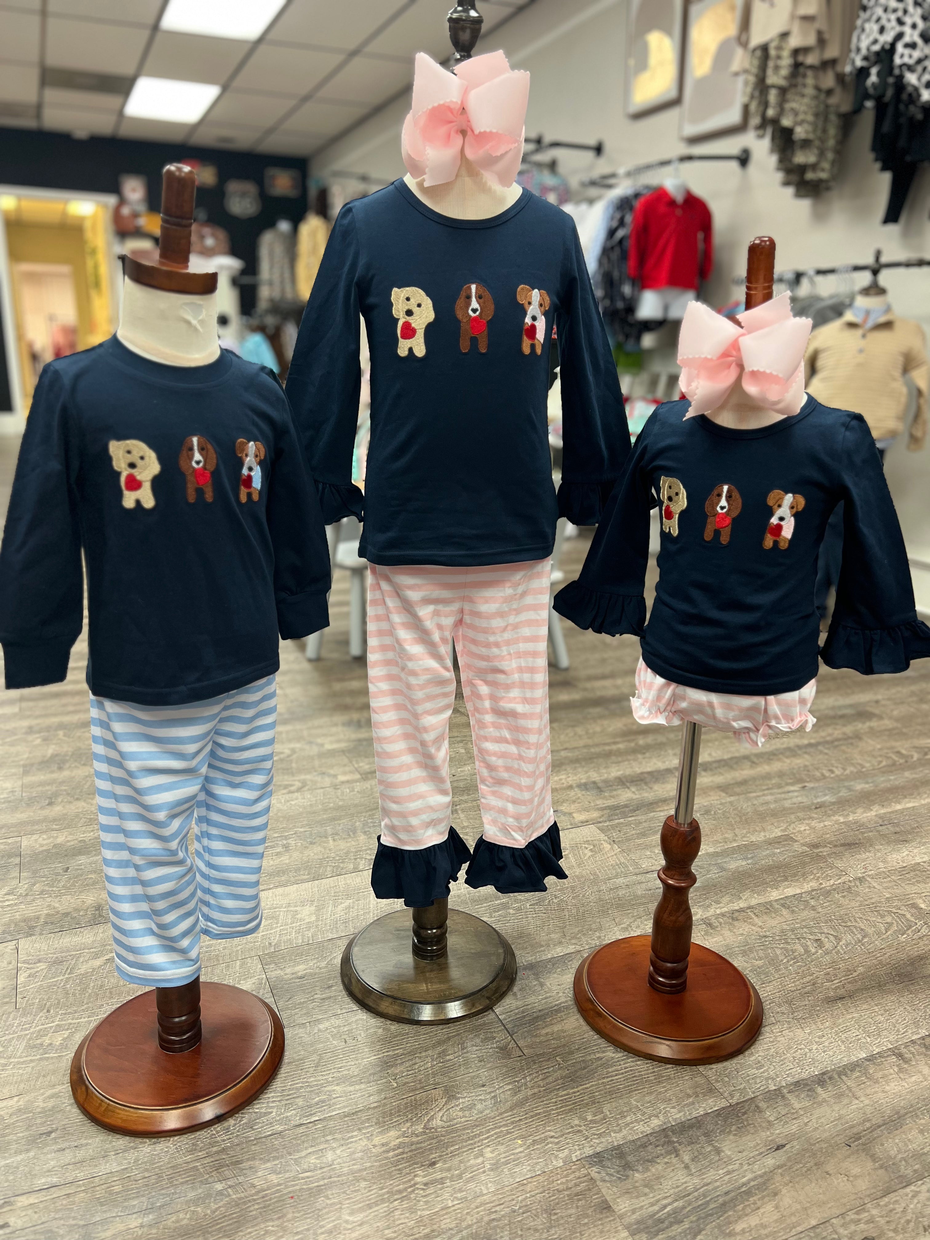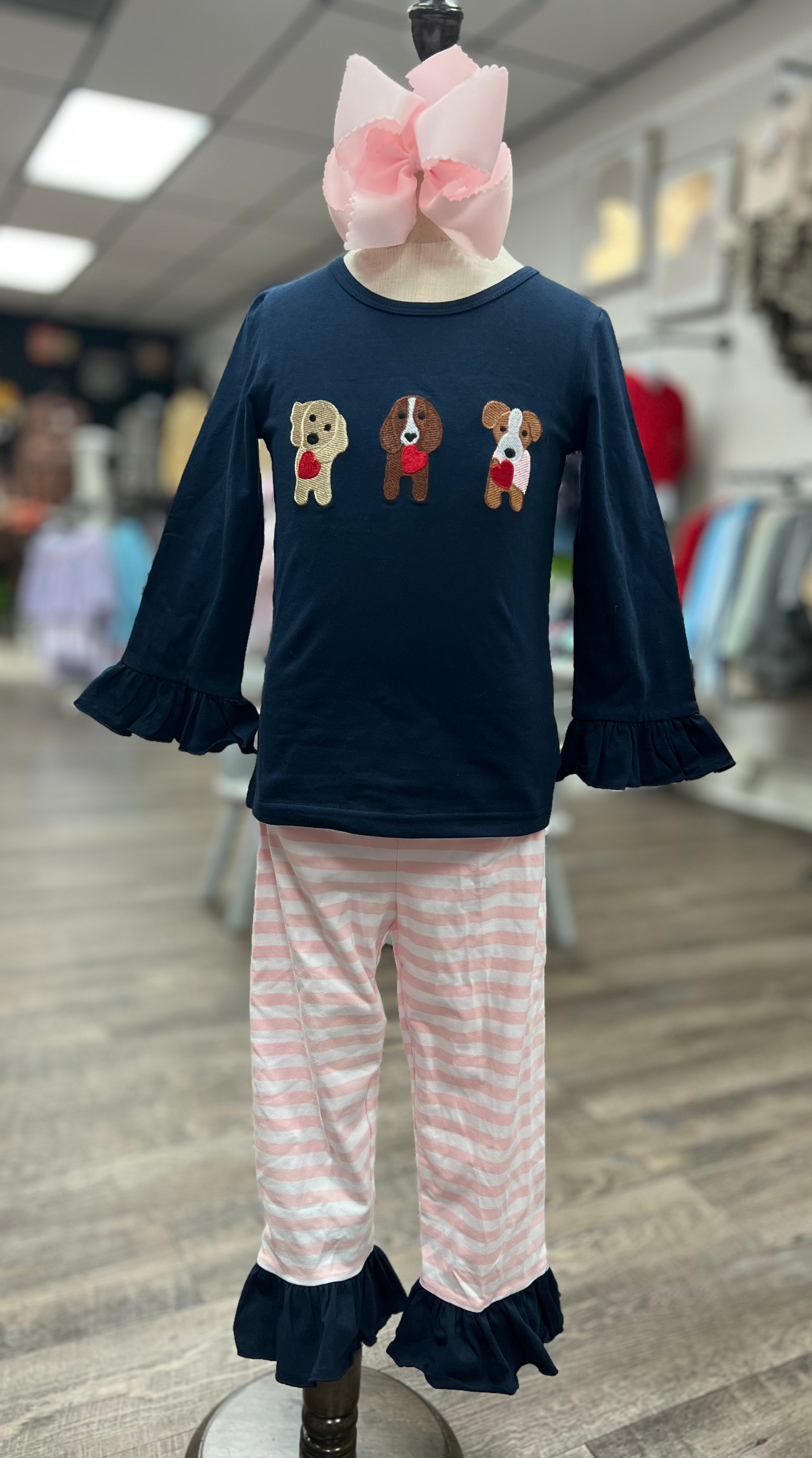 Get ready to fall head over heels for our "I Woof You FurEver" Girl Set! This charming set features a long sleeve navy knit top with three lovable puppies holding hearts as an applique. The pink and white striped pants, with navy ruffled bottoms, add a playful touch to this adorable outfit. Show your love for your little one with this set!