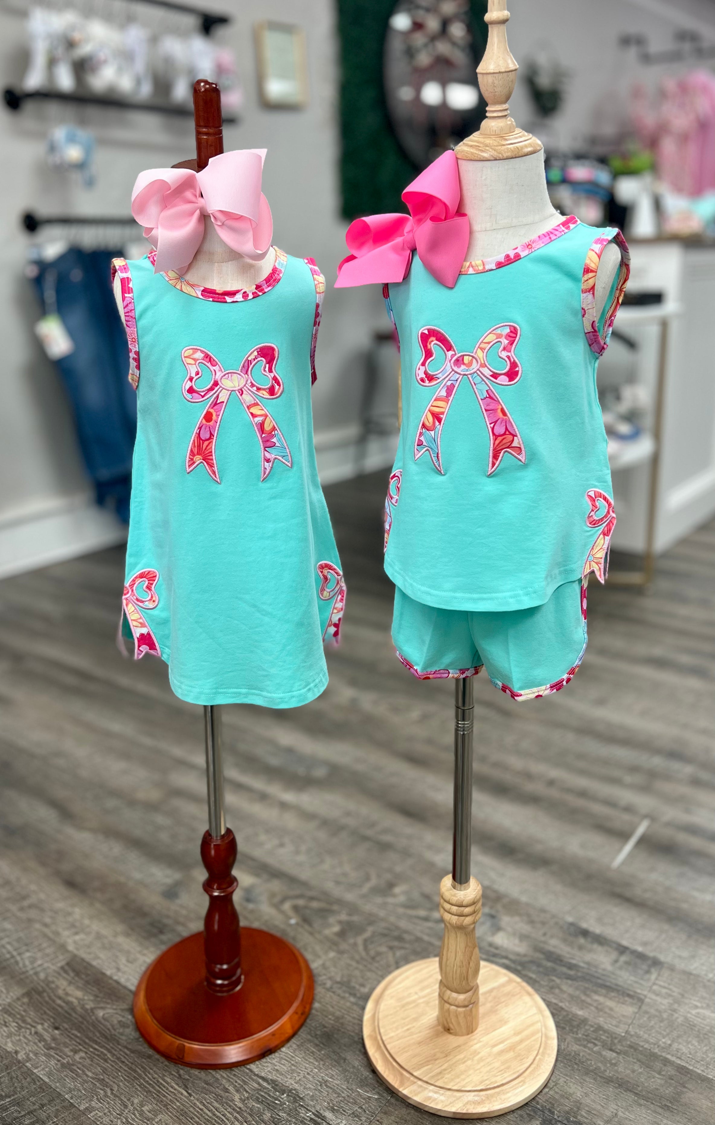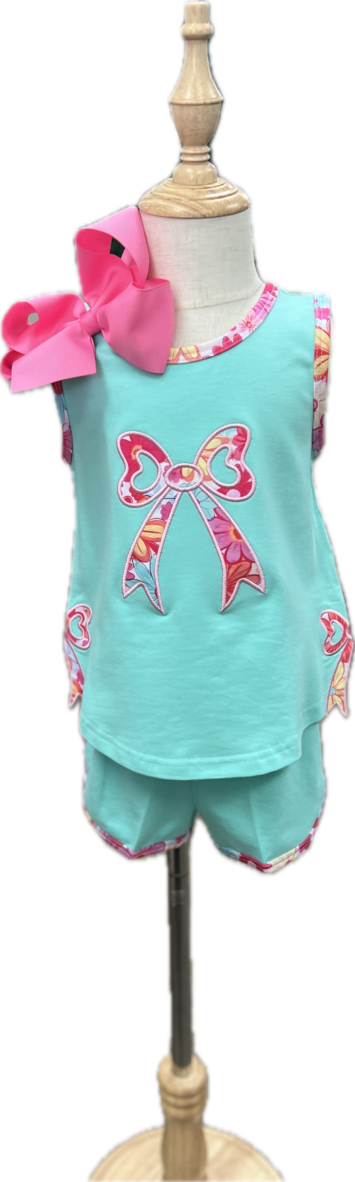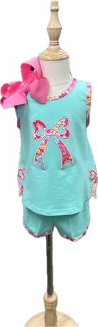 Sweet meets sporty in this comfy pink short set with the cutest bow details! Featuring contrast trim and a large bow appliqué in pink paisley tones, this set is perfect for playdays and picture days alike.