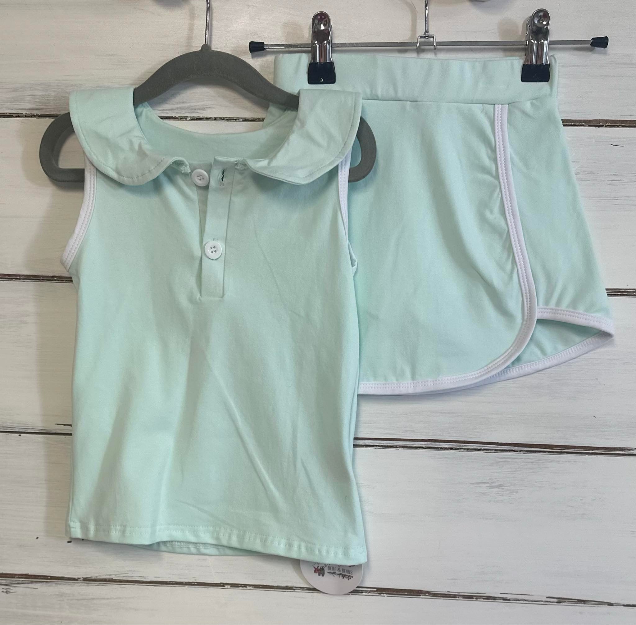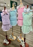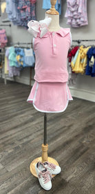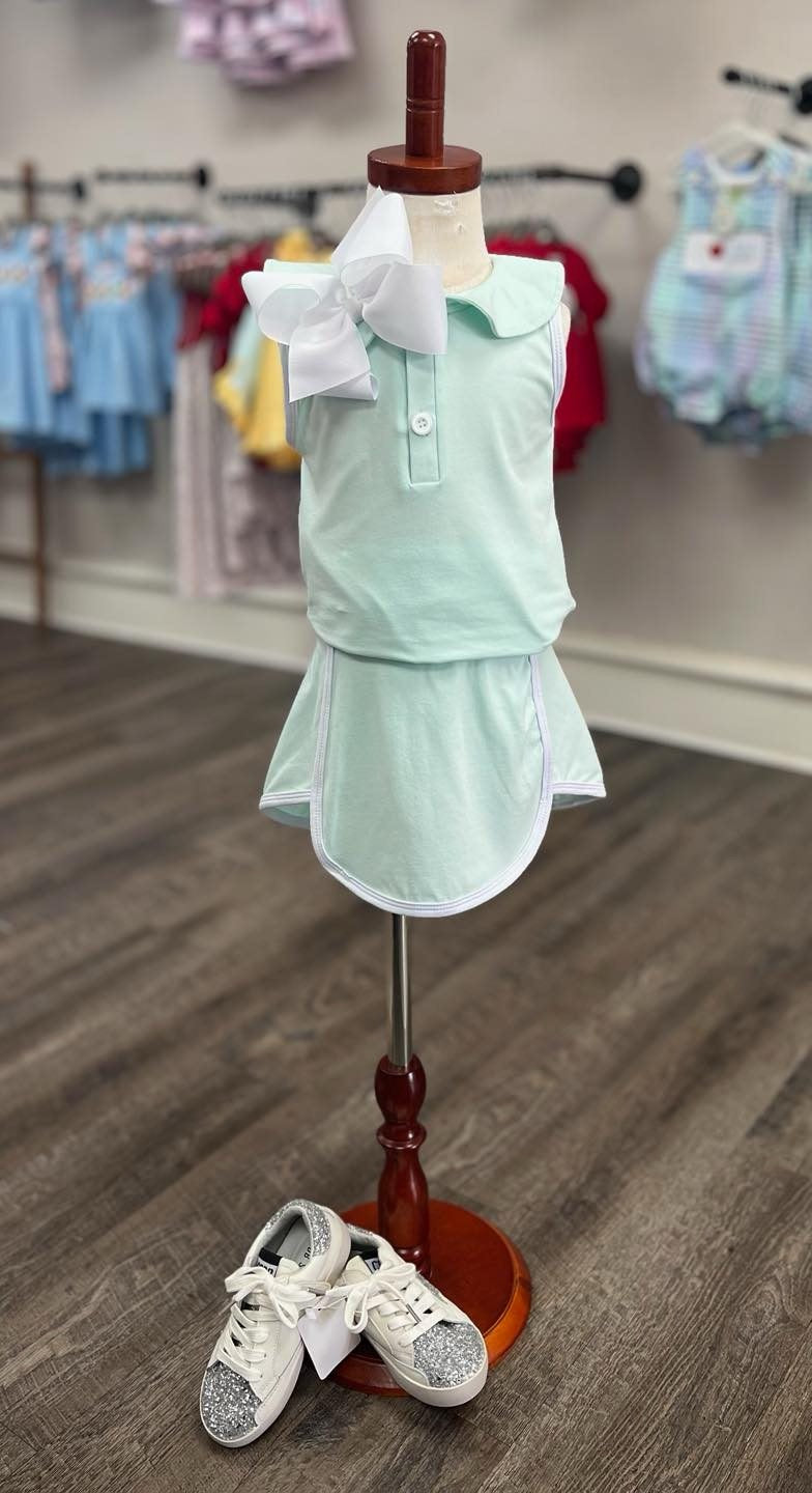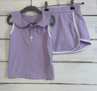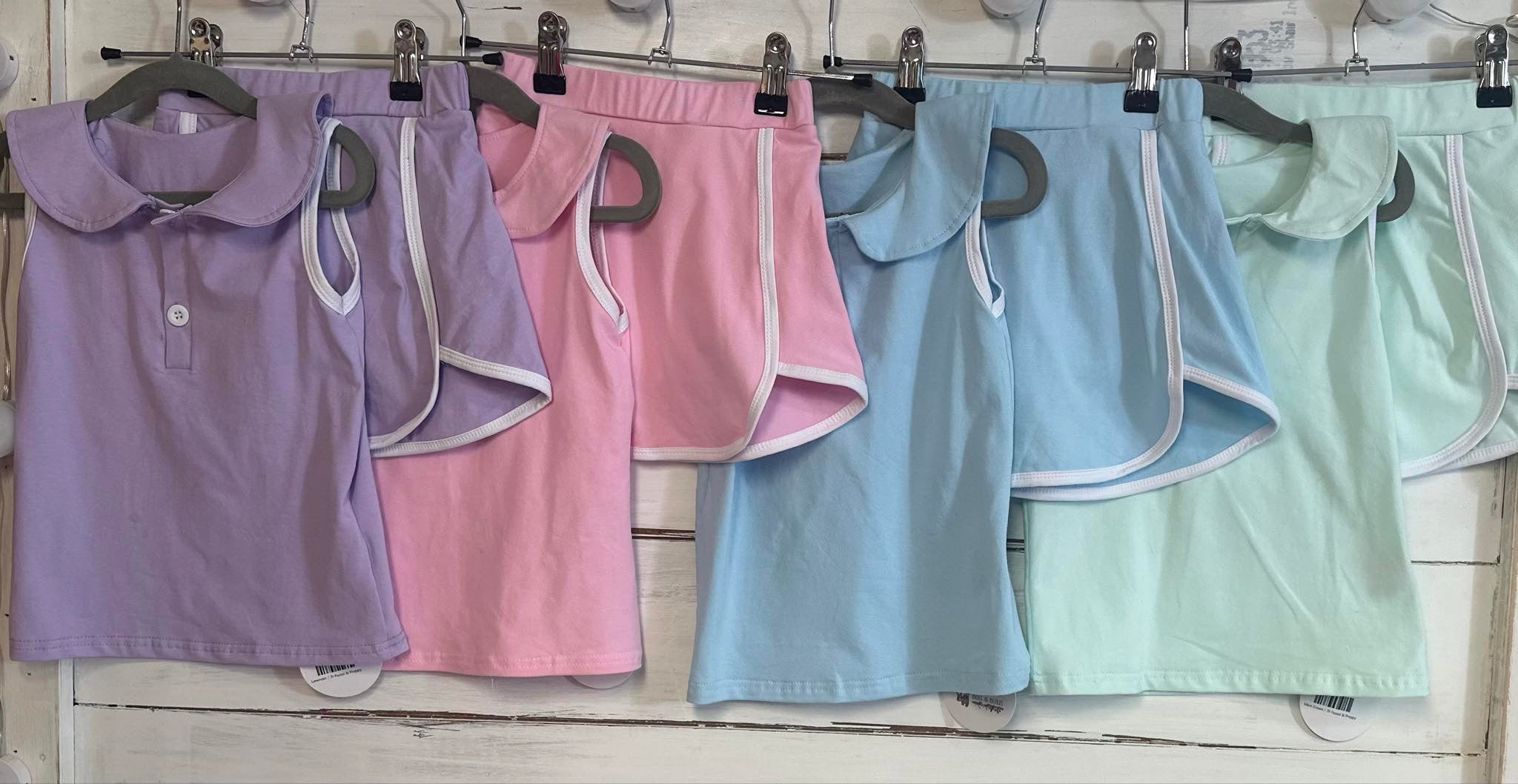 Stay stylish this summer with our must-have Pastel & Preppy set! This set features a knit sleeveless collar polo and matching skorts, available in refreshing mint green, lavender, pink, and light blue. Perfect for summer camp and everyday wear, add a touch of preppy charm to your wardrobe with Pastel & Preppy.