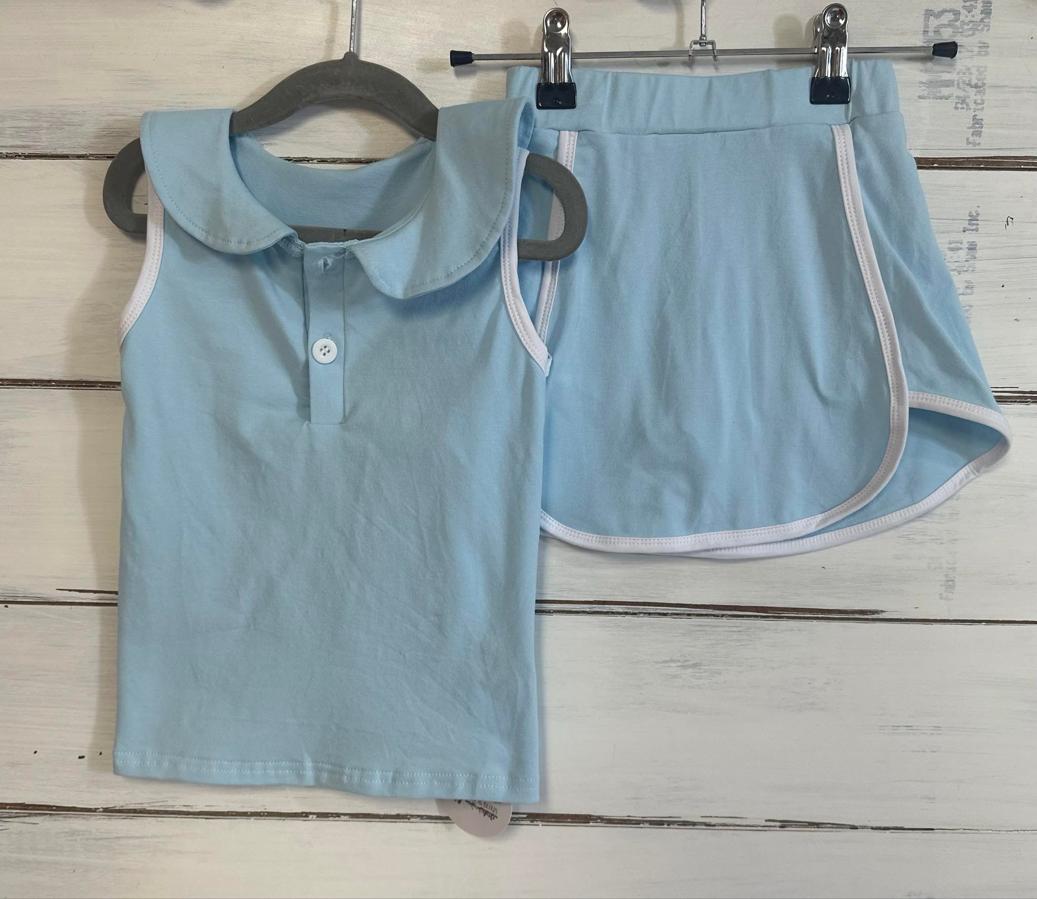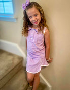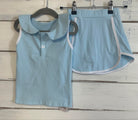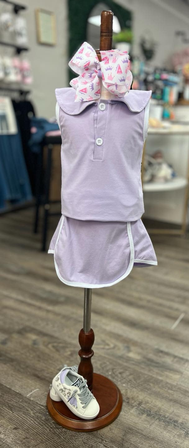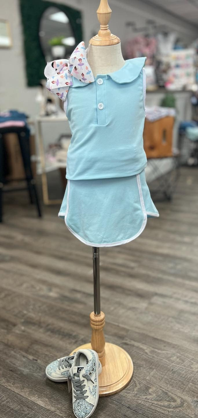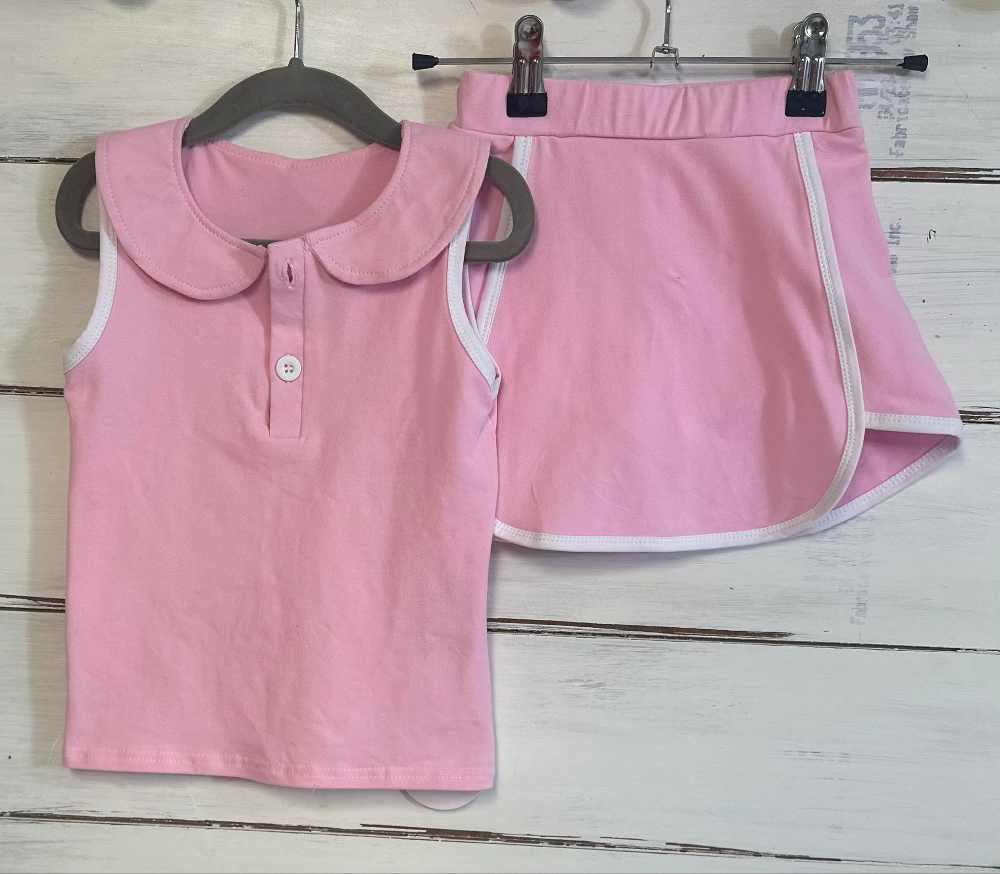 Stay stylish this summer with our must-have Pastel & Preppy set! This set features a knit sleeveless collar polo and matching skorts, available in refreshing mint green, lavender, pink, and light blue. Perfect for summer camp and everyday wear, add a touch of preppy charm to your wardrobe with Pastel & Preppy.