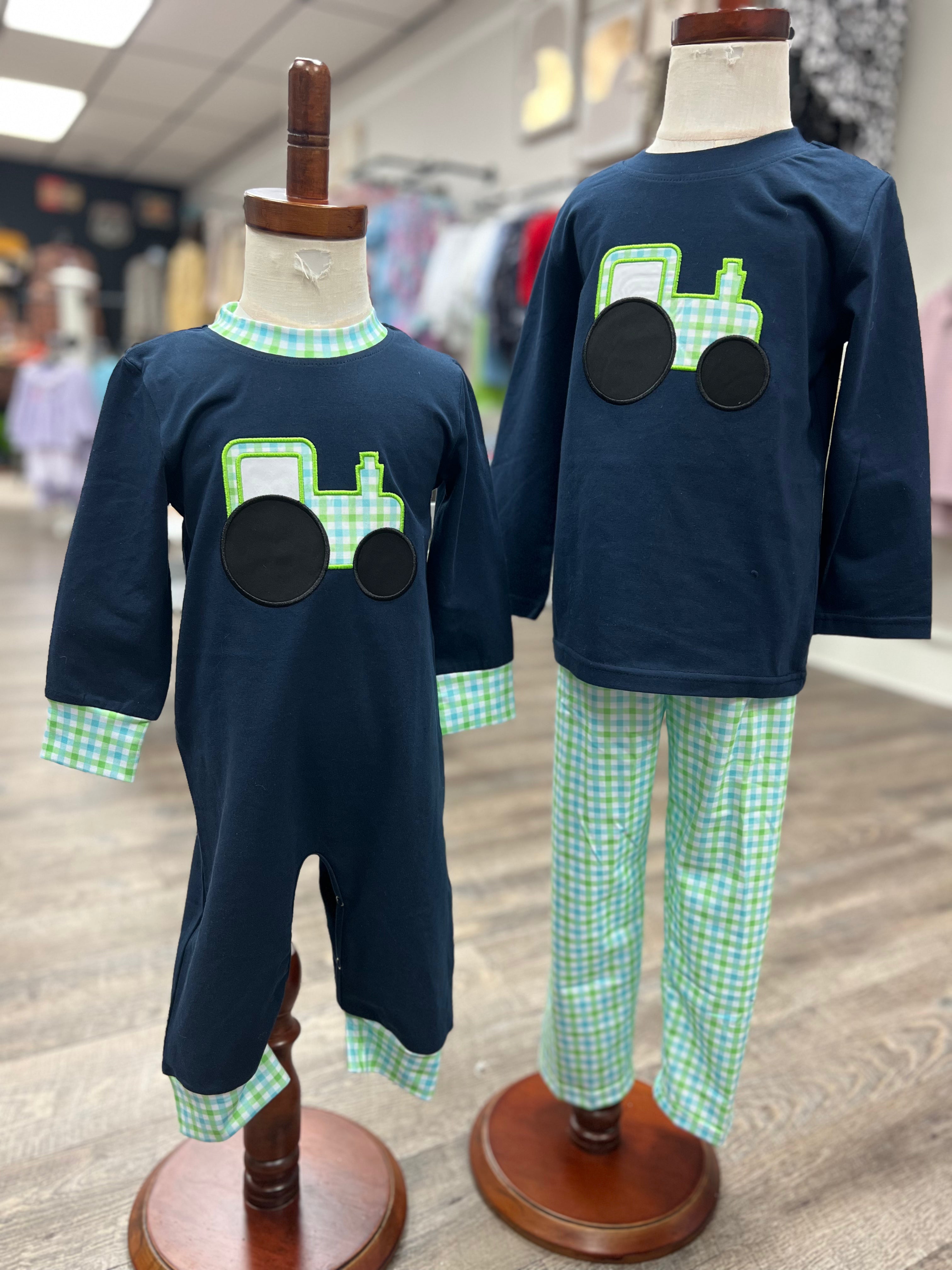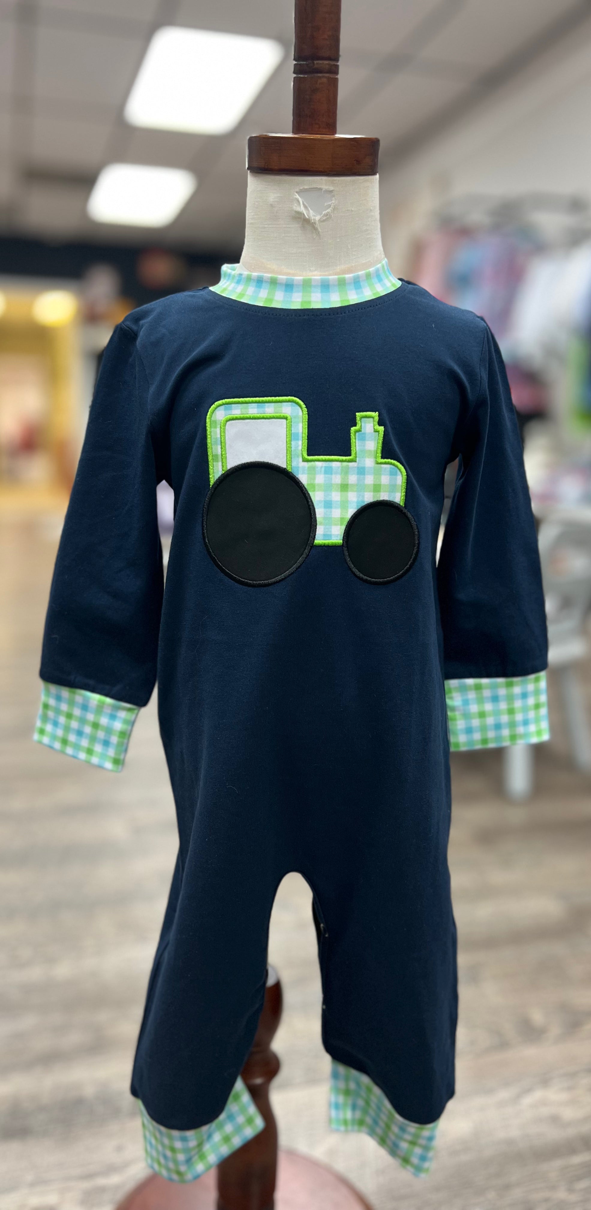👦 Boy Romper: Classic navy with green gingham trim and a bold tractor applique.