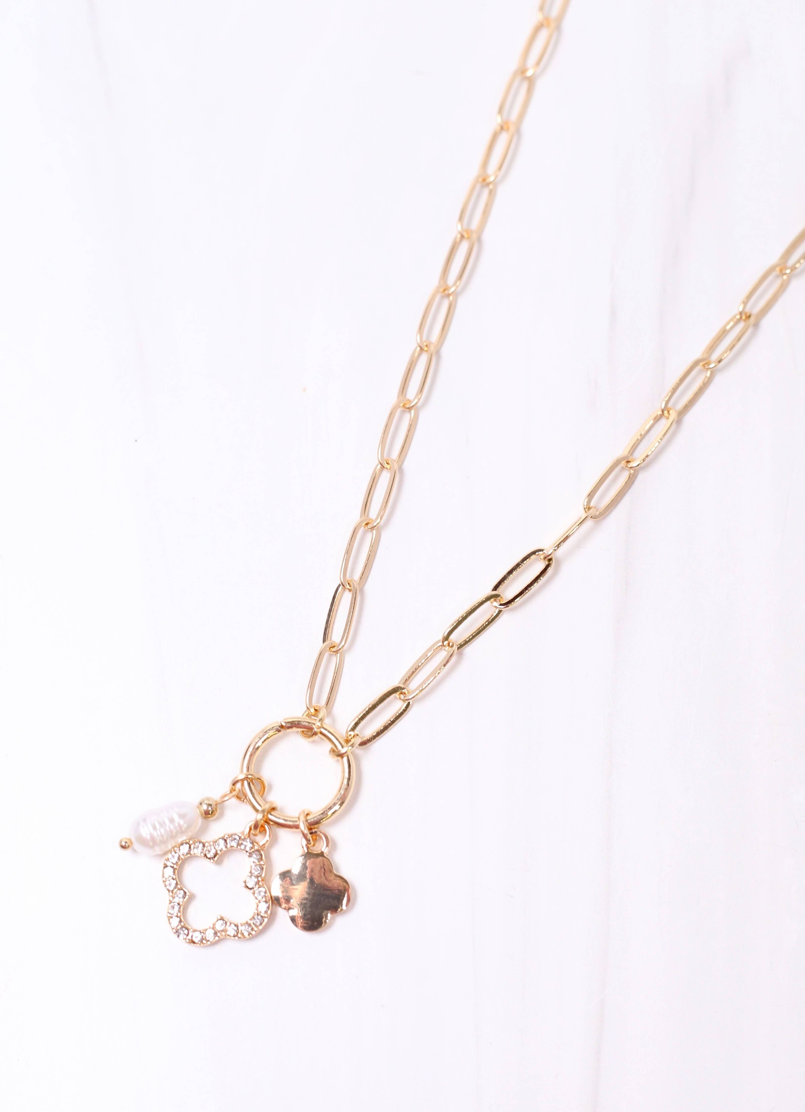 This link necklace features a delicate charm cluster that includes a pearl, a CZ-lined clover, and a gold clover. It creates a whimsical yet elegant accessory for any occasion.