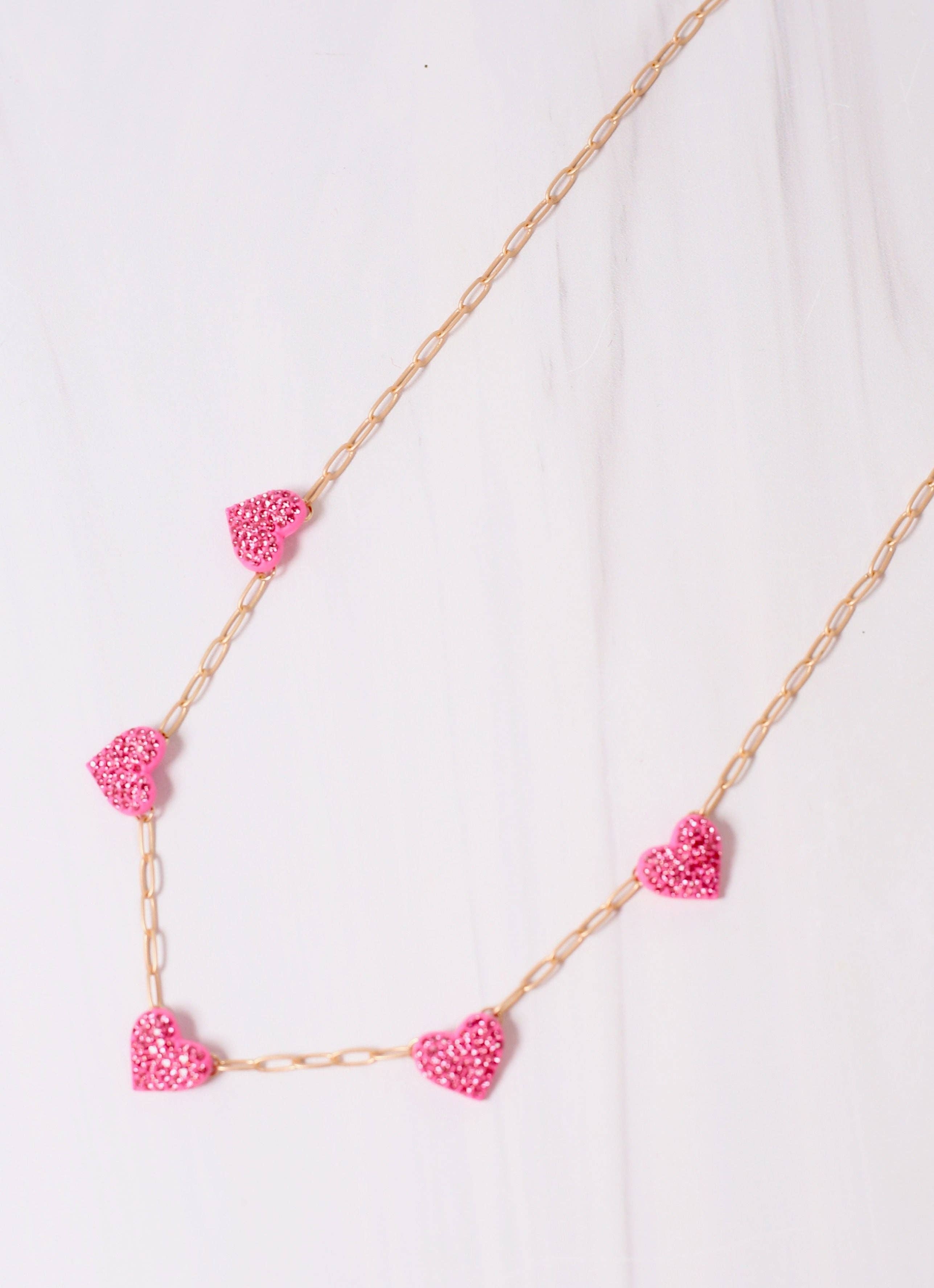 This matte gold link necklace features five coated metal heart charms filled with tone on tone CZs.