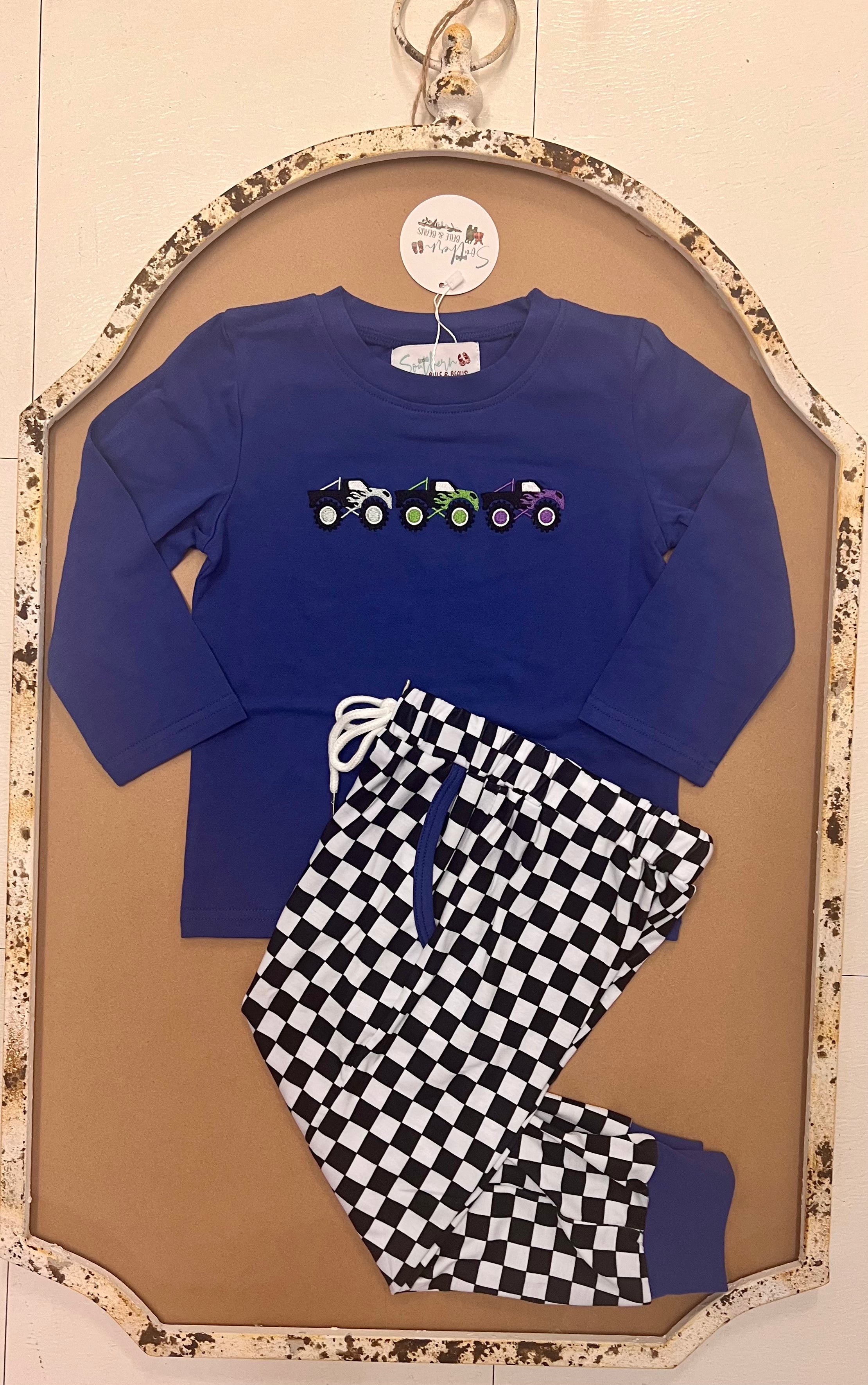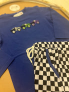 Ready, set, race! The Big Pit Stop Racer Jogger Set is built for little boys with big imaginations and even bigger adventures. This two-piece set features a royal blue long-sleeve top with colorful monster trucks across the chest and bold black-and-white checkered joggers that look straight off the racetrack. With real pockets, a working drawstring, and an elastic waistband, it’s made for playdates, errands with mom, school days, and every pit stop in between.
