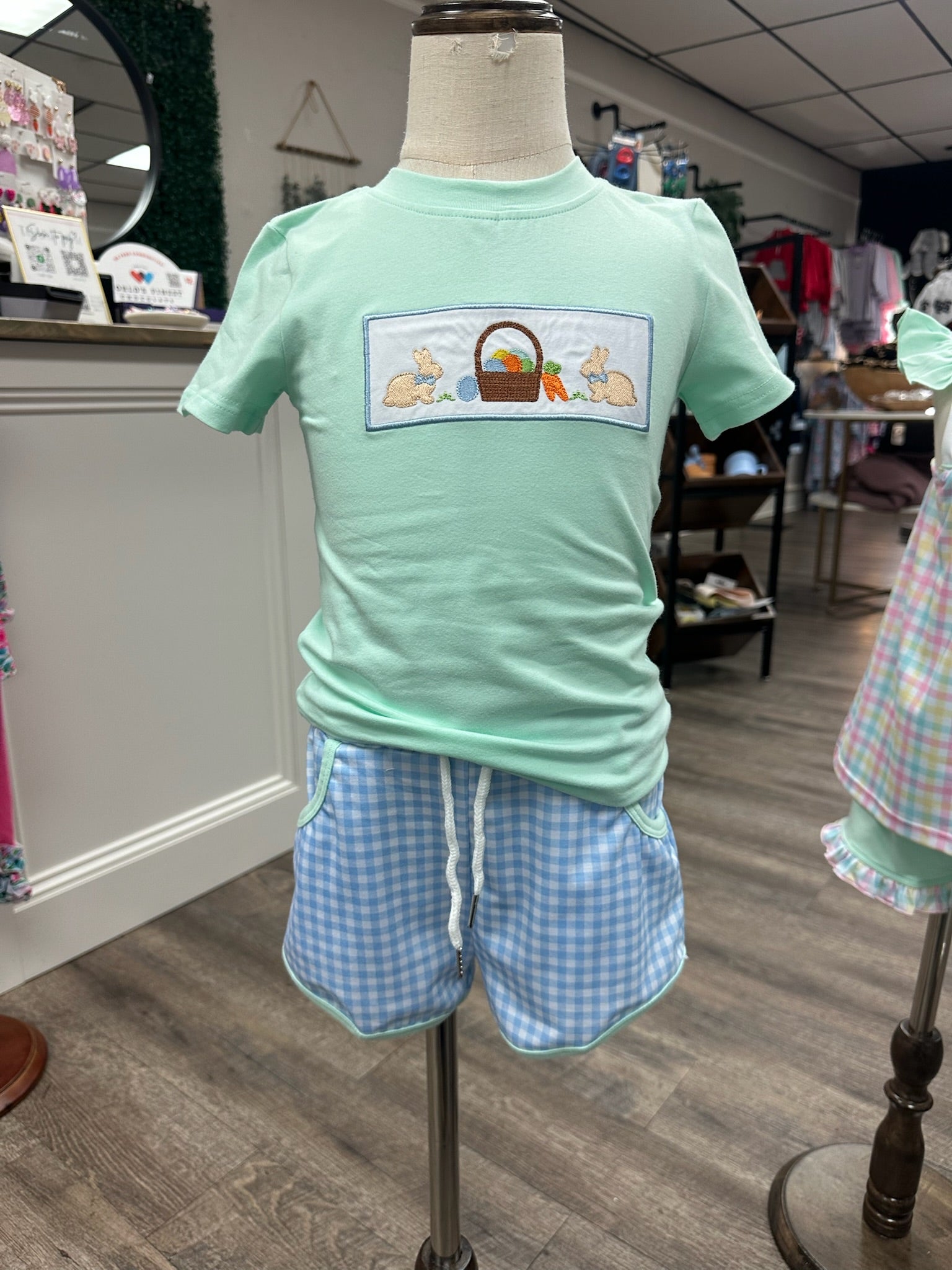 - Light blue gingham shorts coordinate beautifully and work beyond Easter