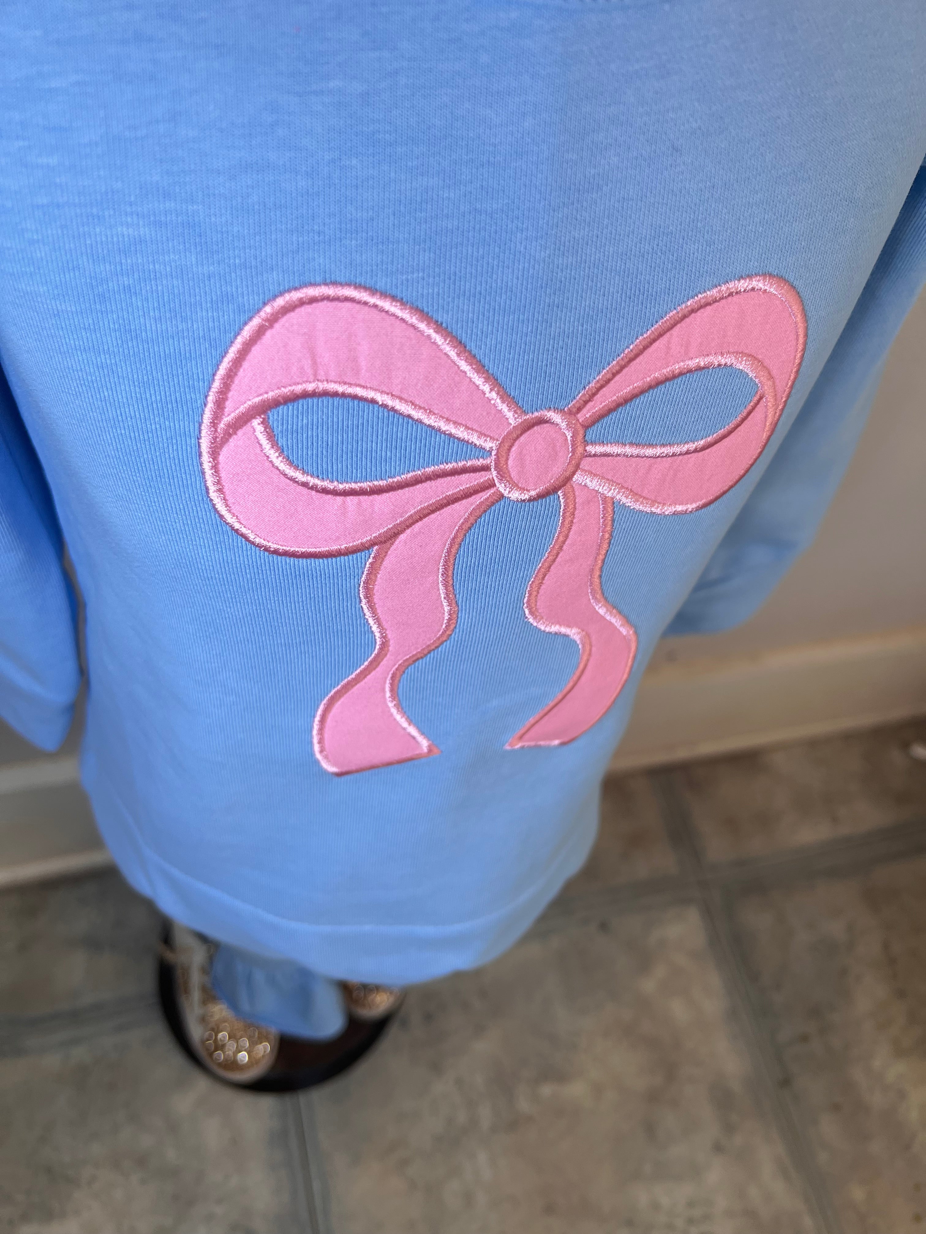 • Signature pink bow appliqué
