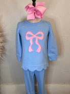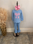 Sweet meets sassy in our Bow’d & Boujee Jogger Set — a pastel dream with that irresistible boutique flair. The soft blue knit paired with the pink statement bow gives this set the perfect mix of girly charm and playful attitude. Finished with scalloped detailing and ruffled jogger bottoms, it’s comfy enough for everyday wear and cute enough for pictures, parties, and all her “look at me, Mama!” moments.