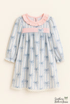 Sweet, classic, and full of charm — the Bows & Beauty Dress was made for tea parties, twirls, and Sunday mornings with Mama. This soft blue and white striped dress features delicate watercolor-style bows, a pink ruffle neckline, matching chest panel, and scalloped hemline for a timeless, heirloom look. Made from buttery soft fabric with stretch and comfort, it’s perfect for photos, church, birthdays, or any day she wants to feel beautiful.