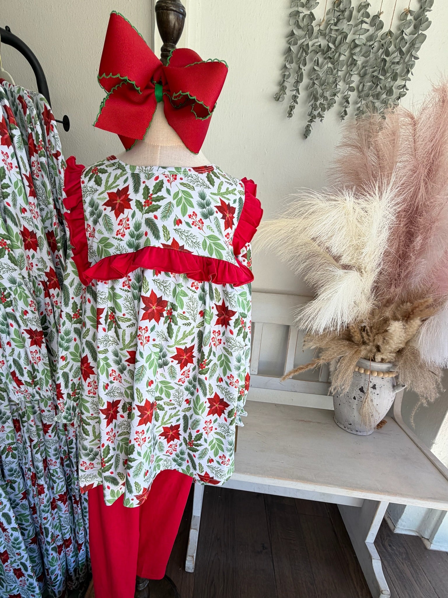 Holiday poinsettia and greenery print with red ruffle bib detail