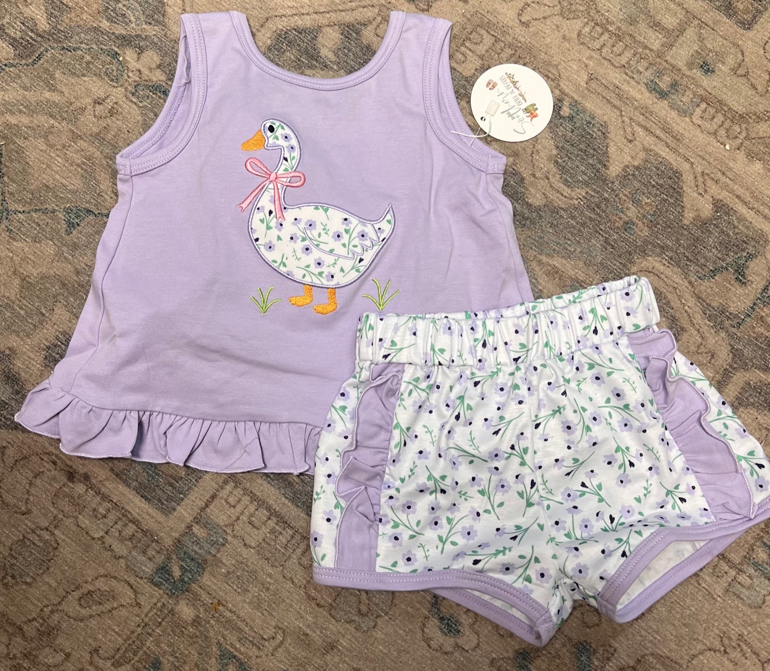 This short set is the perfect summer alternative to the bloomer set—it has all the same sweet details but with a bit more coverage for active toddlers. The embroidered goose with the tiny bow and floral details is absolutely precious, and the coordinating shorts with the lavender ruffle trim are just darling. We love how versatile it is—dressy enough for special occasions but comfortable enough for everyday play. Plus, it coordinates with the other pieces in the Goosey Gander Garden collection, so you can mix and match for sibling photos or create complete looks.