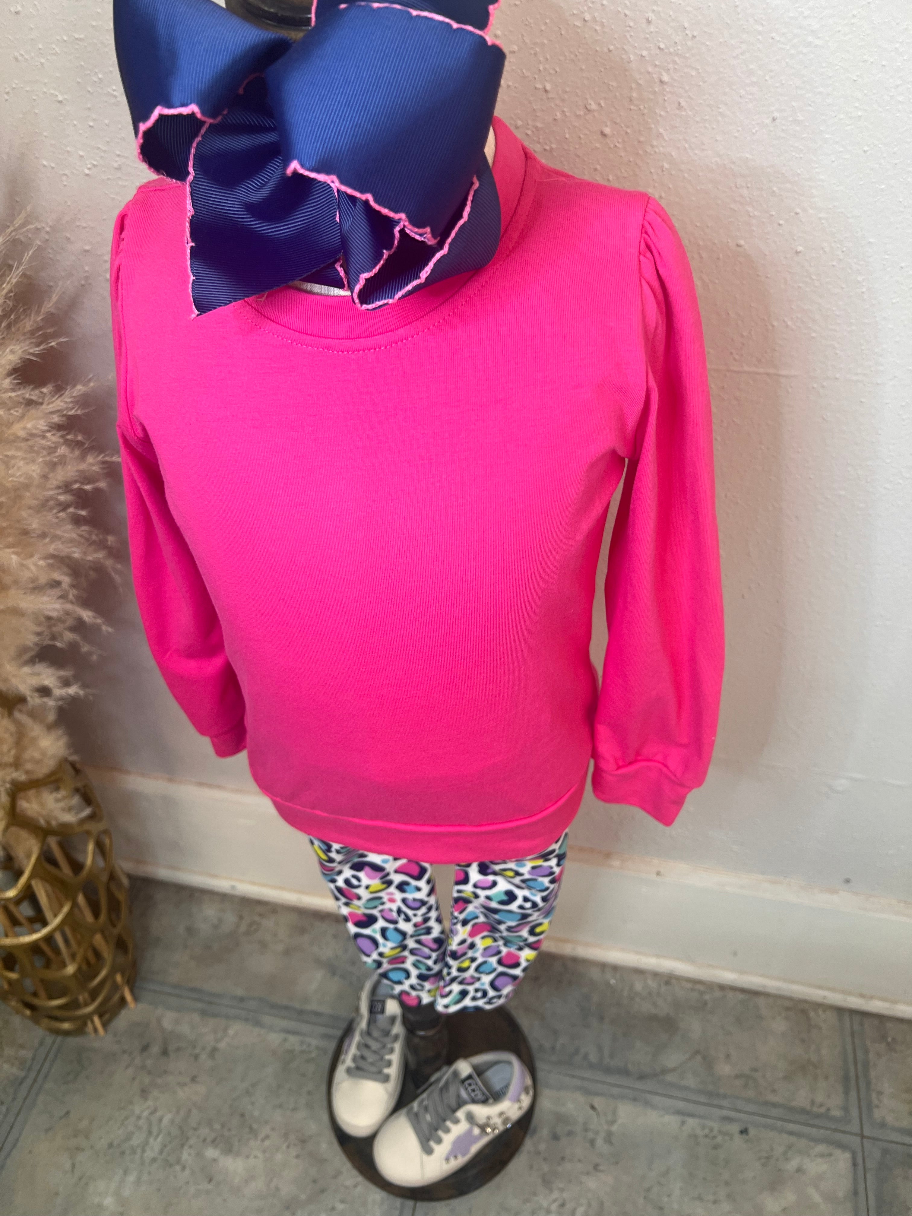 This hot-pink top pairs perfectly with the neon rainbow leopard athletic pants for a look that’s straight out of every ’90s mama’s childhood dreams. It’s soft, stretchy, eye-catching, and made for all-day play. Your girl will live in this one!