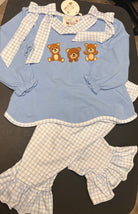 Your girl will fall in love with our Me & My Teddy Set — a cozy-soft top featuring embroidered teddy bears and oversized gingham shoulder bows for that irresistible boutique look. Paired with coordinating gingham ruffle pants, this outfit blends comfort, charm, and classic Southern sweetness. A perfect sibling match to the Me & My Teddy Diaper Set!