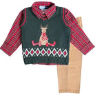 Your little gentleman will be ready for all the holiday fun in our Reindeer Games Set — a classic Christmas look by Good Lad. This timeless three-piece outfit features a green sweater vest with a playful reindeer appliqué, red contrast tipping, and argyle trim along the hem. The button-front plaid shirt adds festive charm, while the soft tan corduroy pants complete the look with cozy comfort and style. Perfect for Christmas photos, church, and every merry moment in between!