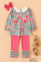 This two-piece pant set features a precious snowberry floral tunic with a classic white Peter Pan collar (hello, Southern sweetness! 💗) and matching pink ruffle pants with coordinating floral flutters. She'll love the comfy fit, and you’ll love how picture-perfect she looks for holiday events, church, Christmas photos, and every frosted moment in between.