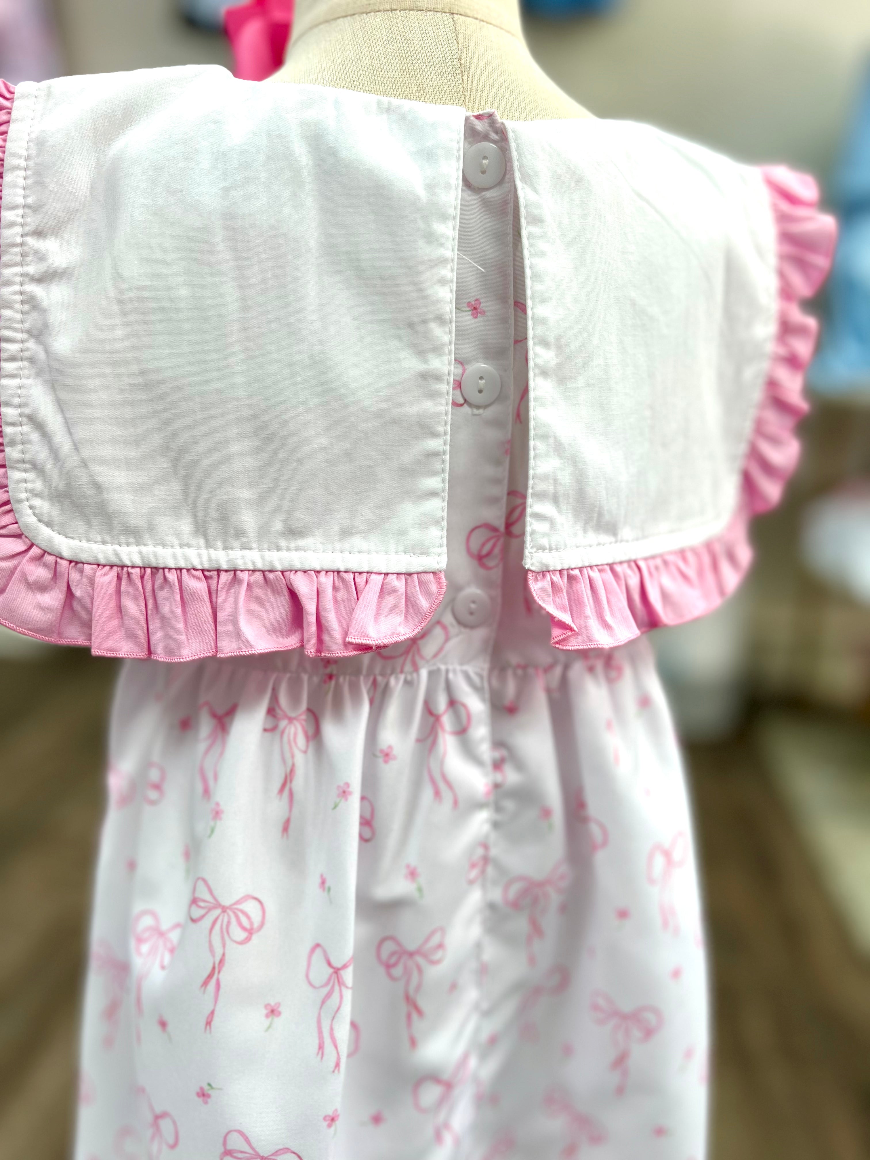 - Crisp white bib collar with pink ruffle trim adds Southern charm without being overly fussy