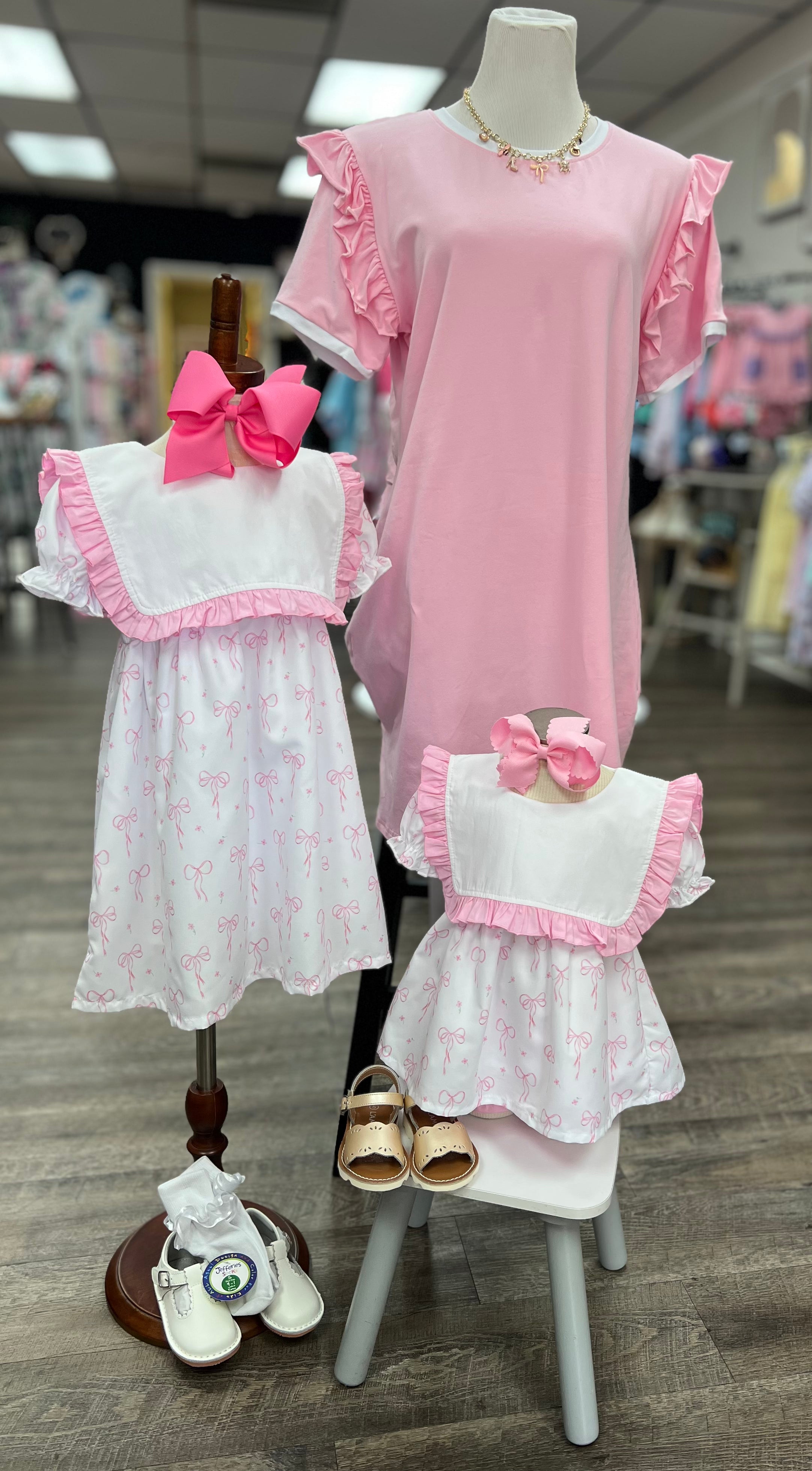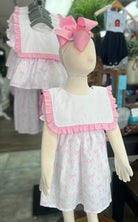 We chose the Sugarplum Ribbons Dress because it captures that timeless Southern charm we adore while being practical enough for real life. The custom pink bow print is absolutely precious, and the classic bib collar gives it that heirloom quality we love. The fact that it's fully lined and comes with a matching hair bow makes it a complete outfit that's ready for any occasion. It's the kind of dress that makes little girls feel special and moms feel confident.