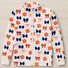 Stay cozy and spirited all season long in our Tiger Bows & Touchdowns Mom Pullover. Designed for the mamas who cheer the loudest, carpool the farthest, and never miss a kickoff. This athletic-style zip-up features a playful mix of orange Tiger paws, dainty bows, and gameday stars—perfect for showing your team spirit with a touch of feminine flair.