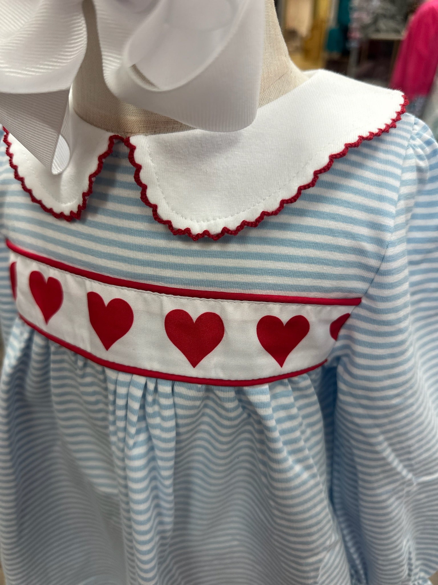 This precious two-piece set features a soft blue-and-white striped tunic with a crisp white Peter Pan collar, delicate red trim, and a row of embroidered red hearts across the chest. Paired with comfy red leggings, this set blends vintage-inspired details with everyday comfort.