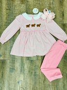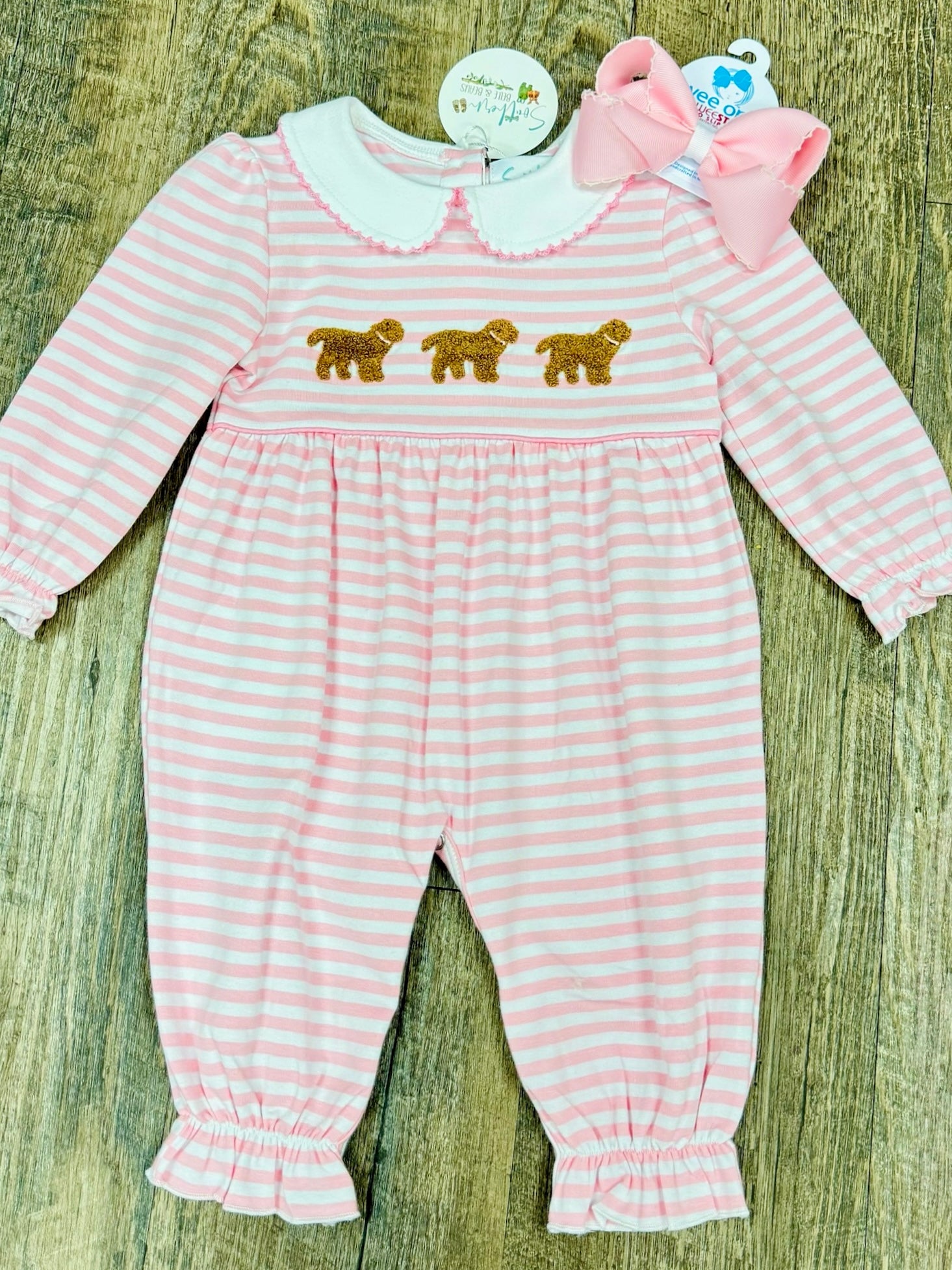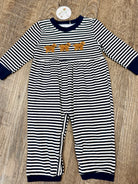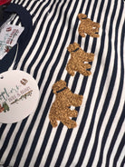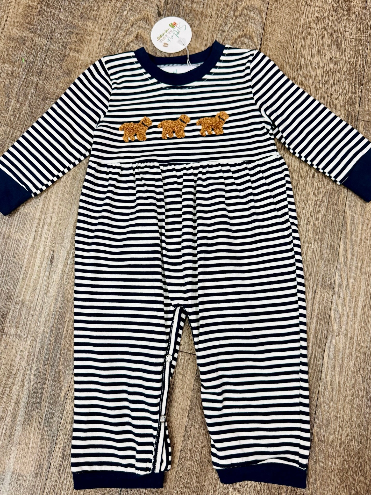 The Wiggle Waggle Romper is playful, comfy, and full of sweet puppy charm. This navy stripe one-piece features three fuzzy pups across the chest, soft stretch fabric, and easy snap closures for quick changes. Perfect for everyday wiggles, stroller walks, picture days, and all your little guy’s adventures. Cute, cozy, and boutique-quality from head to toe.