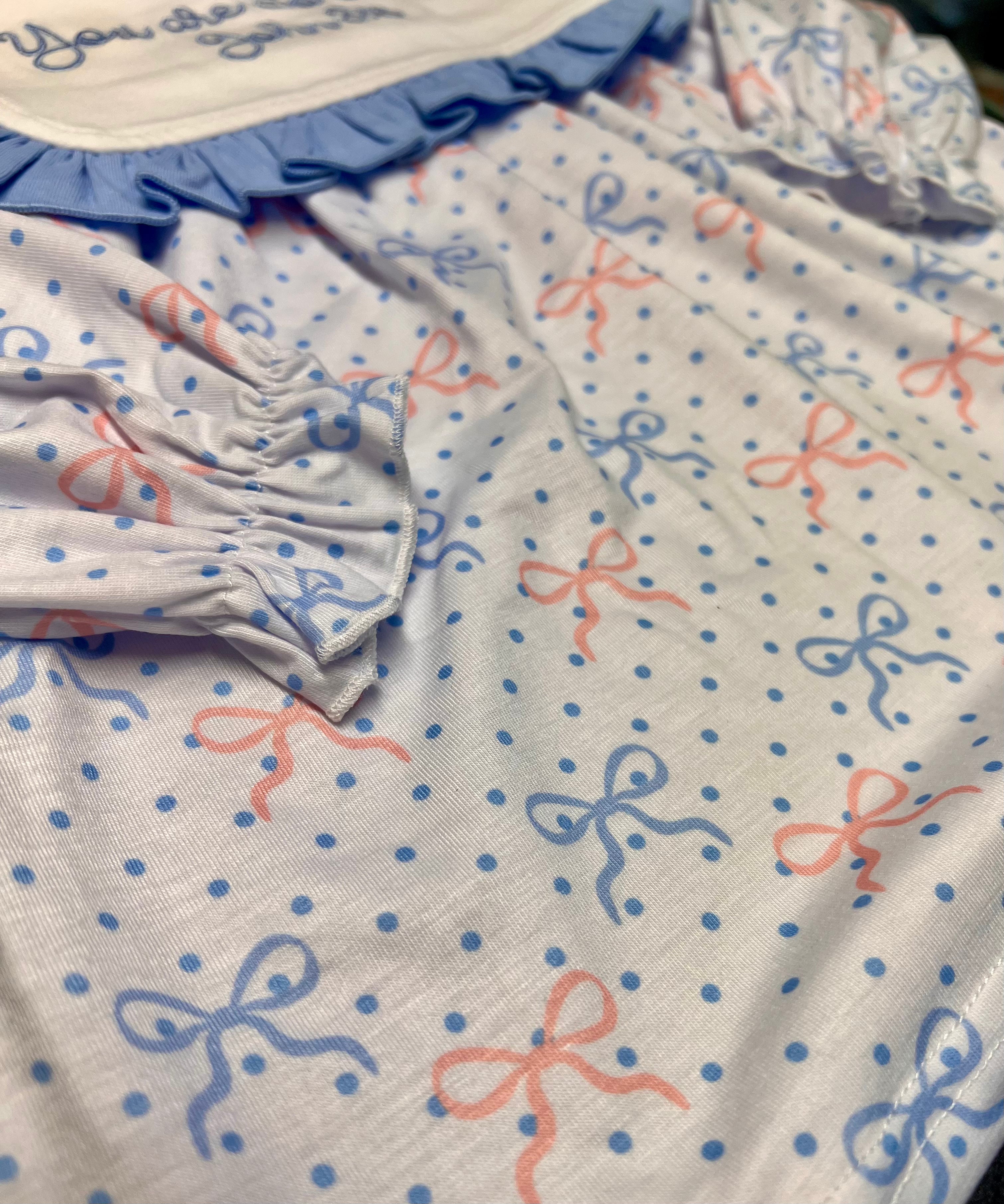 A precious reminder for your sweetest little blessing — our “You Are So Loved” Bubble is designed to wrap your baby girl in comfort, Scripture, and southern sweetness. Featuring soft pastel bows, gentle blue polka dots, and a beautifully embroidered John 3:16 collar with ruffles, this bubble is picture-perfect for church, special outings, or everyday cuddles. Easy, comfy, and meaningful… this one is sure to become a keepsake piece.