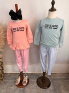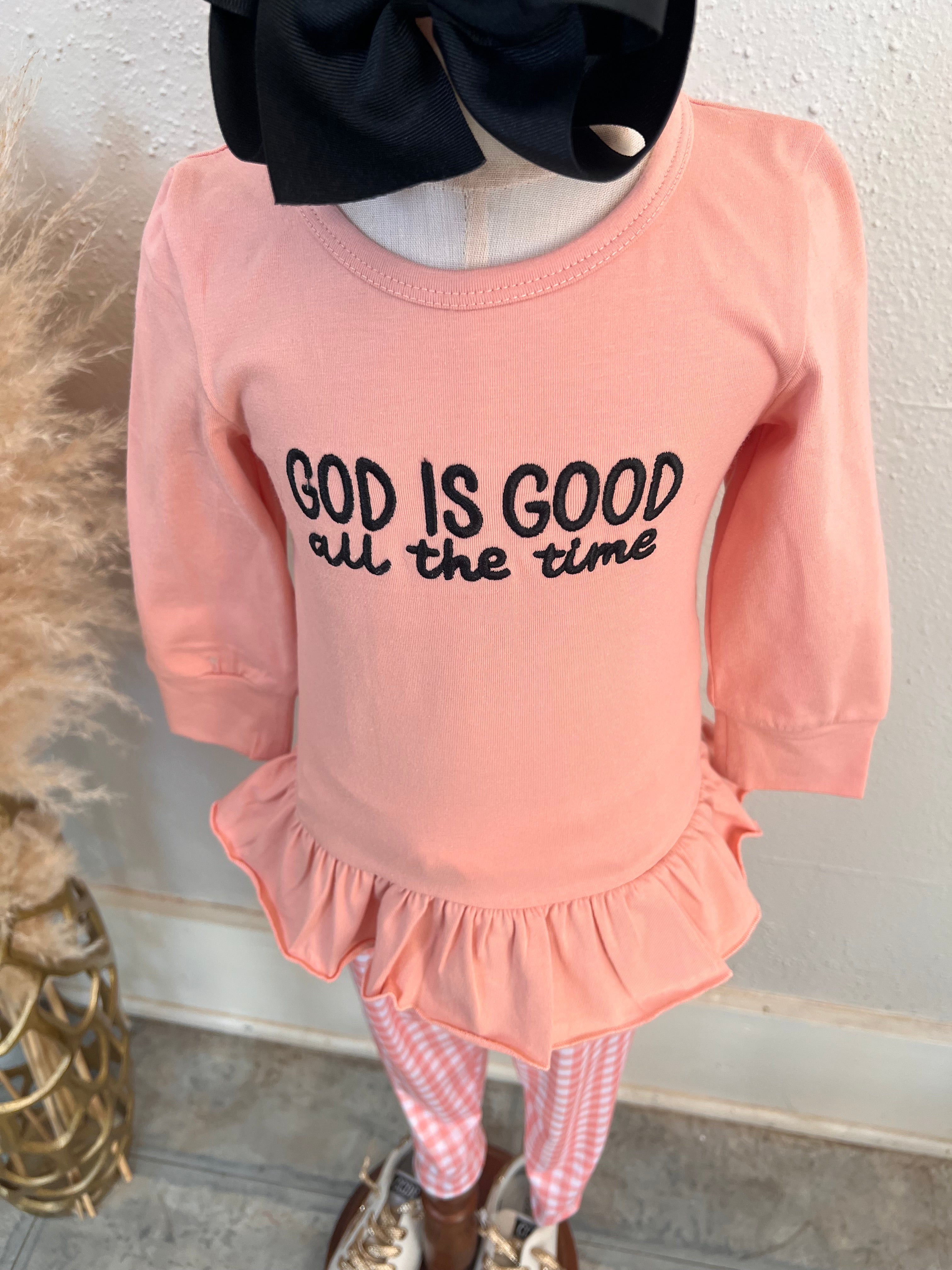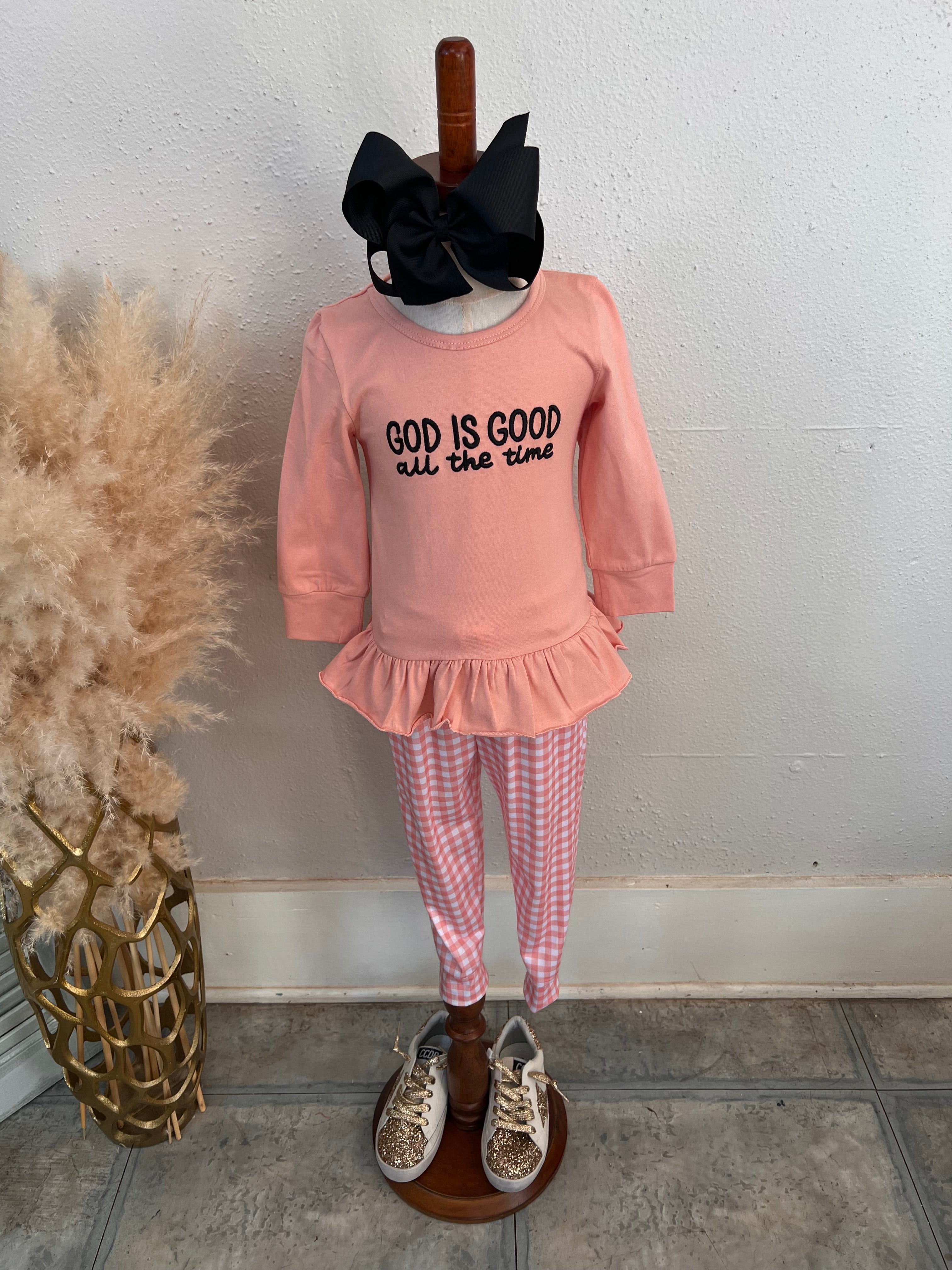 The top features God Is Good All the Time embroidery, paired with ruffle-trim gingham pants that bring all the charm. Soft, comfy, and absolutely adorable for church, playdates, and every day in between.