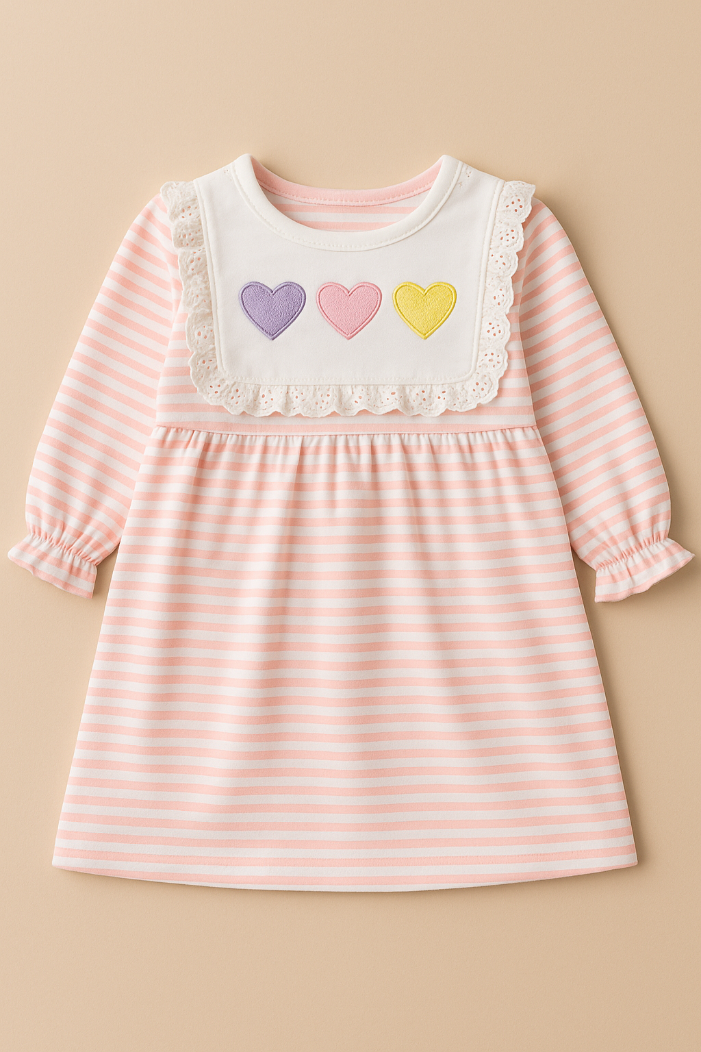 Sprinkled with sweetness from top to bottom, our Candy Heart Crush Dress is made for your little Valentine! Soft pink stripes pair perfectly with the eyelet-trim bib and three pastel embroidered hearts. It’s comfy, twirly, and picture-perfect for school, church, parties, or everyday play. A precious must-have for every girly girl who loves all things bright and happy.
