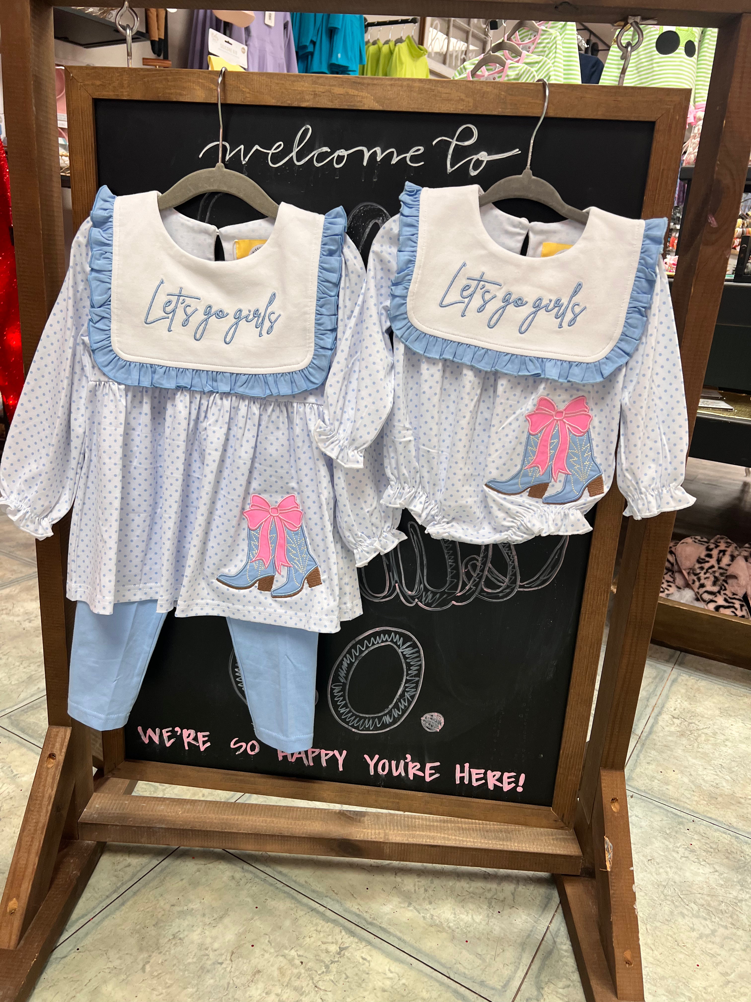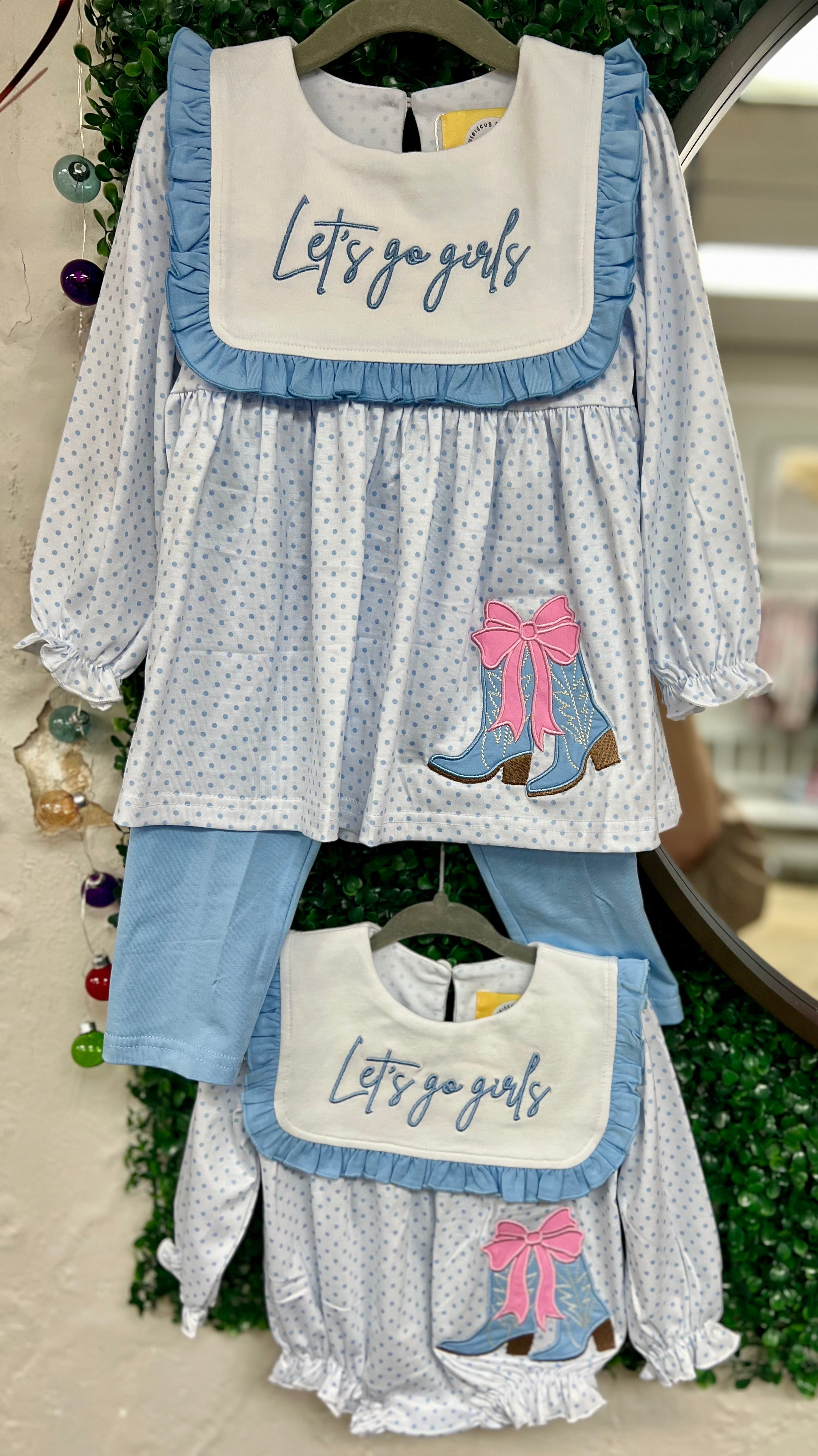 Get your little cowgirl ready for adventure with our Let's Go Girl's Set! This playful outfit includes a white top with baby blue polka dots and cute cowgirl boots with a pink bow. The white bib collar features a baby blue ruffle and a "Let's Go Girls" monogram. Plus, baby blue leggings pants for added comfort. Yeehaw!