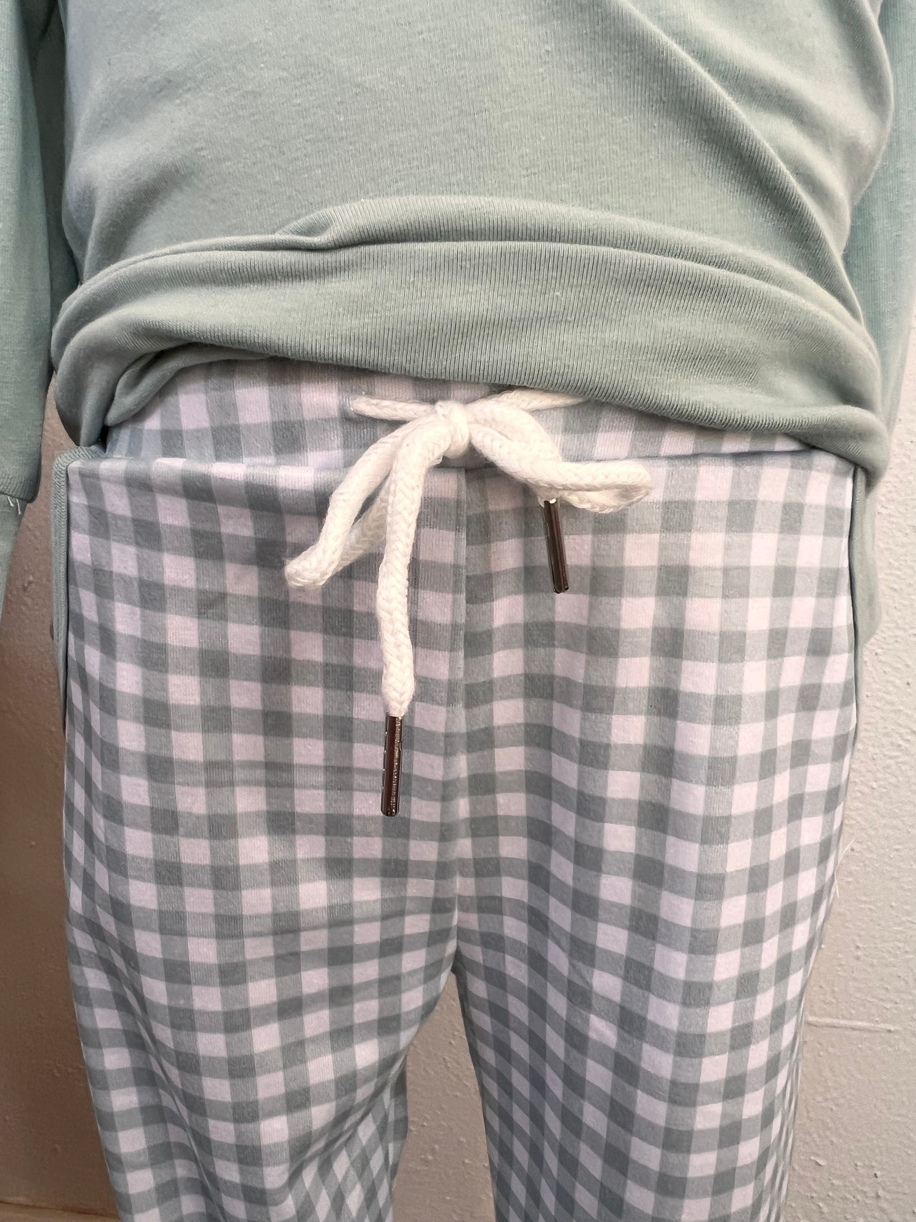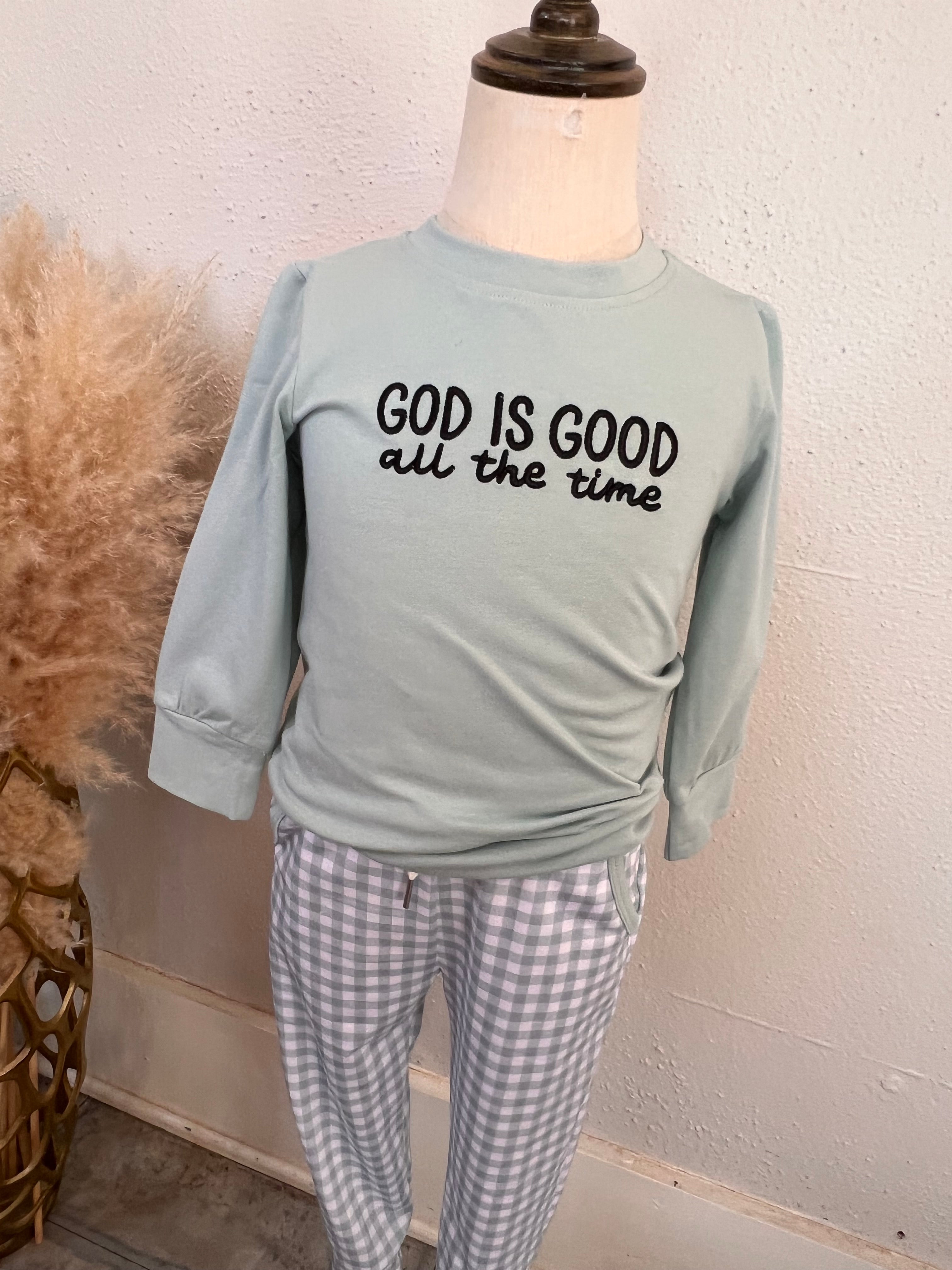 This comfy mint sweatshirt features God Is Good All the Time embroidery, paired with soft gingham joggers made for everyday adventures. A sweet, simple, faith-forward outfit he can wear anywhere — church, school, or playtime.