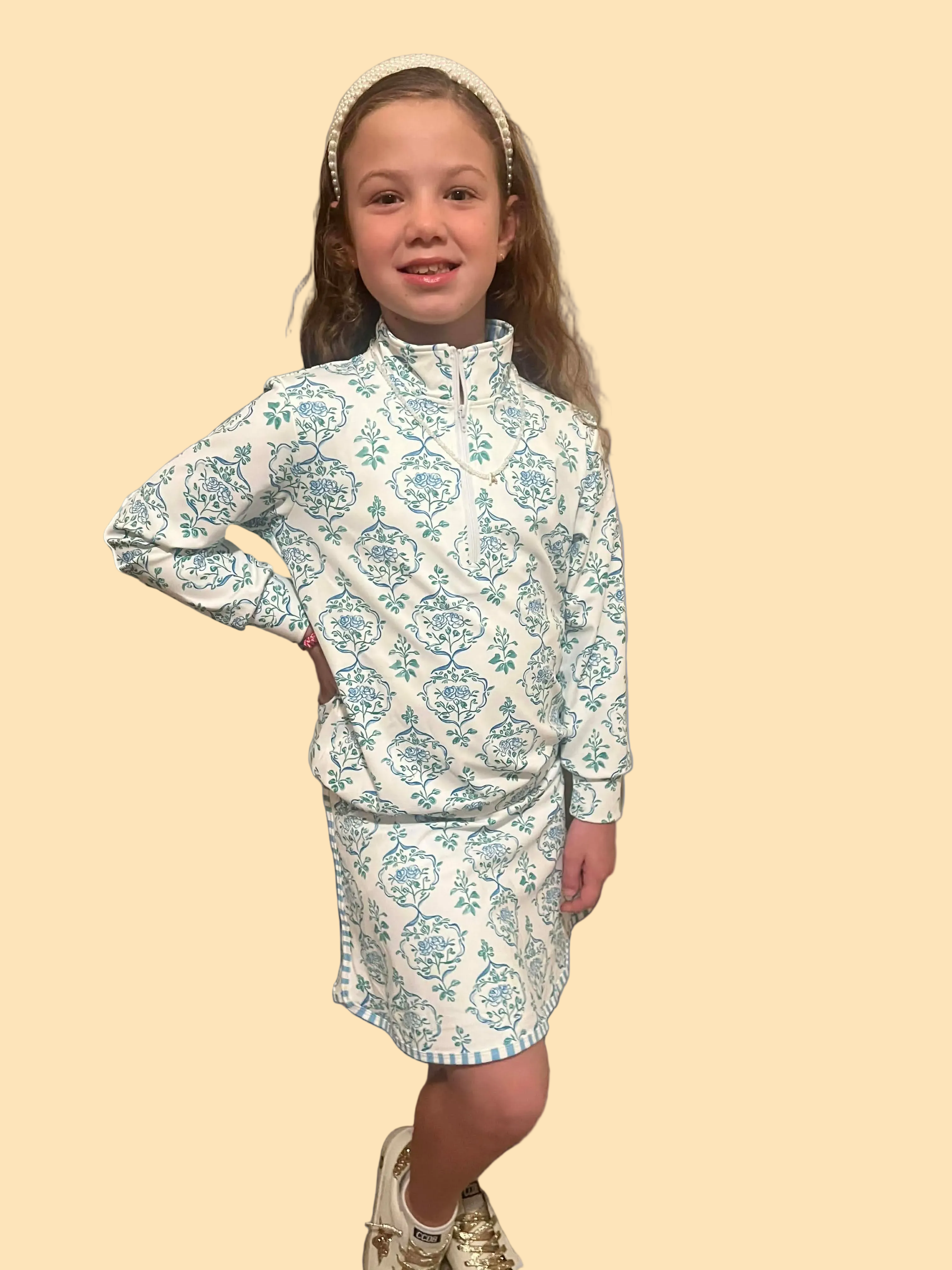 Two-piece set: quarter-zip top + ruffle-waist skirt