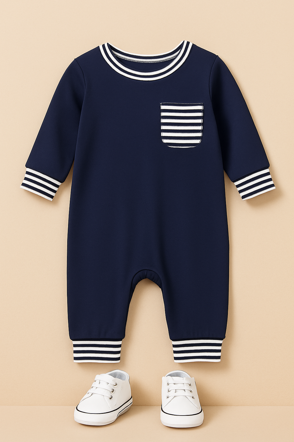Perfect for family photos, seaside strolls, or everyday wear, this piece blends casual comfort with boutique charm that’s made to last. One-piece romper in navy with striped trim
