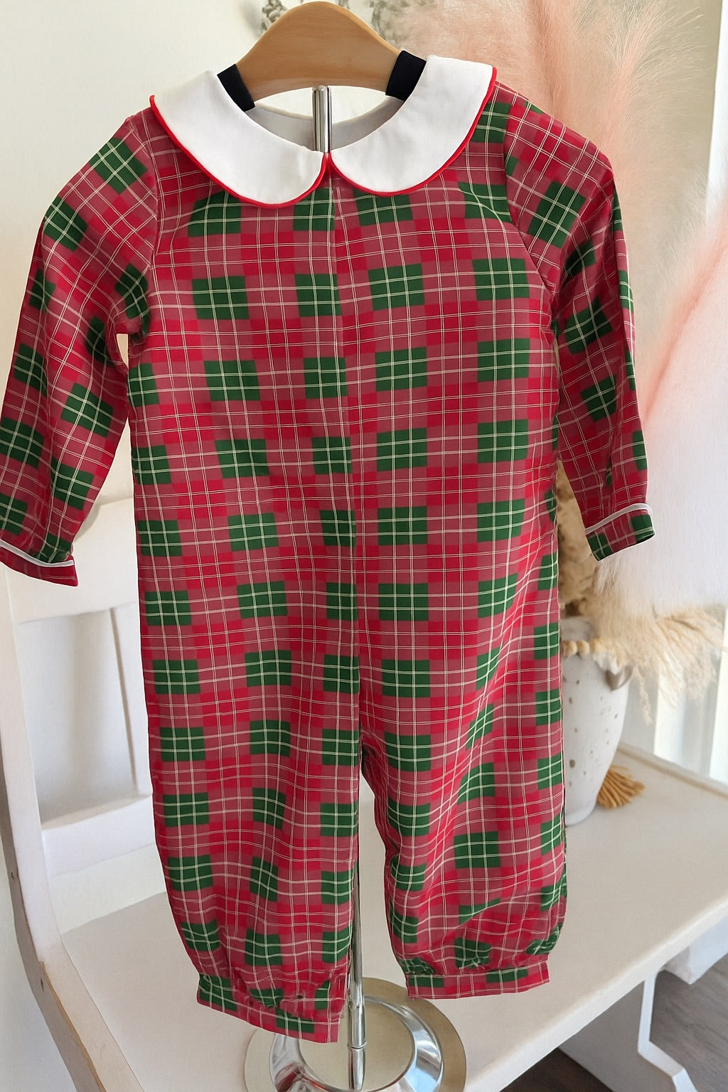 One-piece plaid romper with long sleeves, button closures, and a crisp white Peter Pan collar for a timeless fall look. -