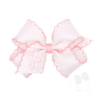 She’ll look heavenly with our white grosgrain king hair bow! Our light pink moonstitch edge and cross embroidery on the tail give it a unique edge for any special occasion—perfect for Baptism, First Communions, Easter, and more! This bow is sure to stay in her hair all day with our patented WeeStay™ no-slip hair clip.