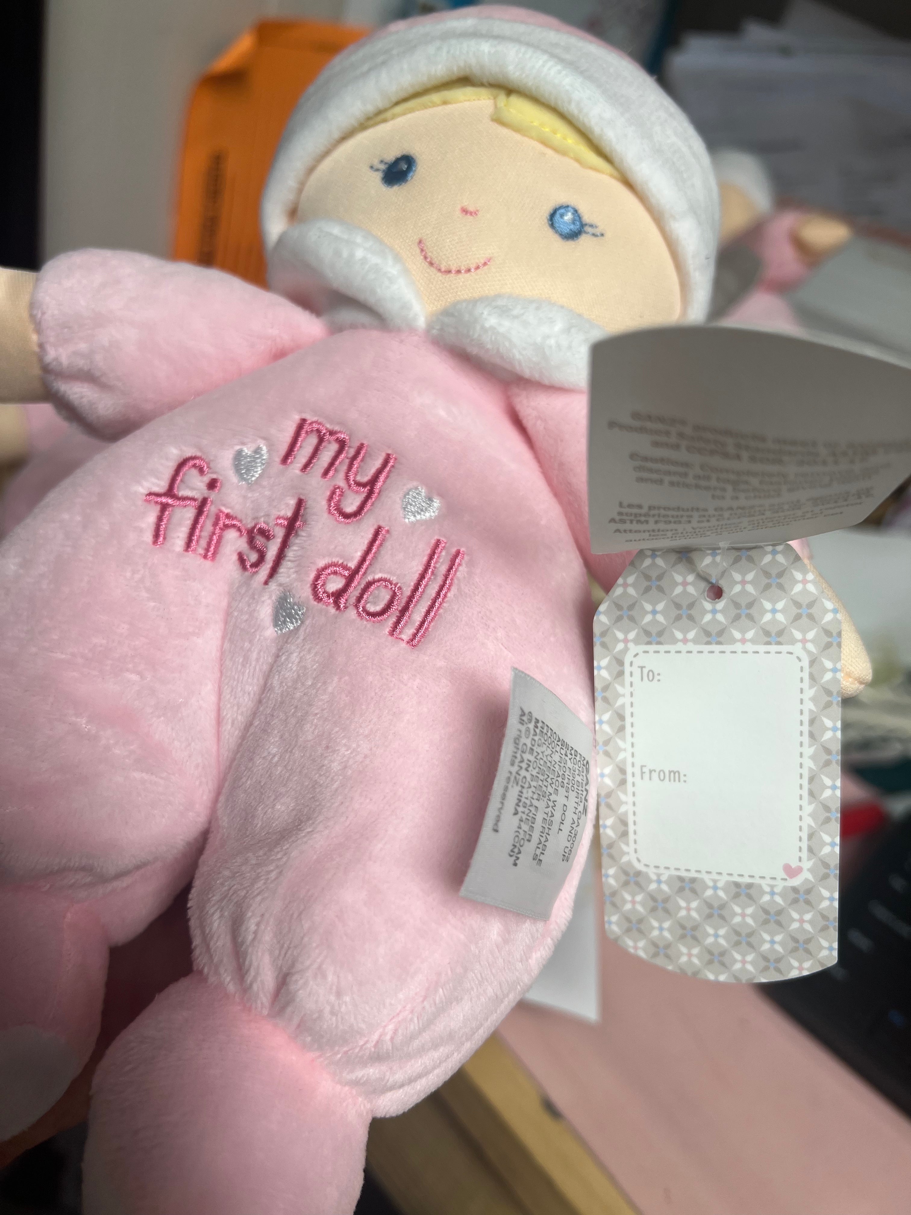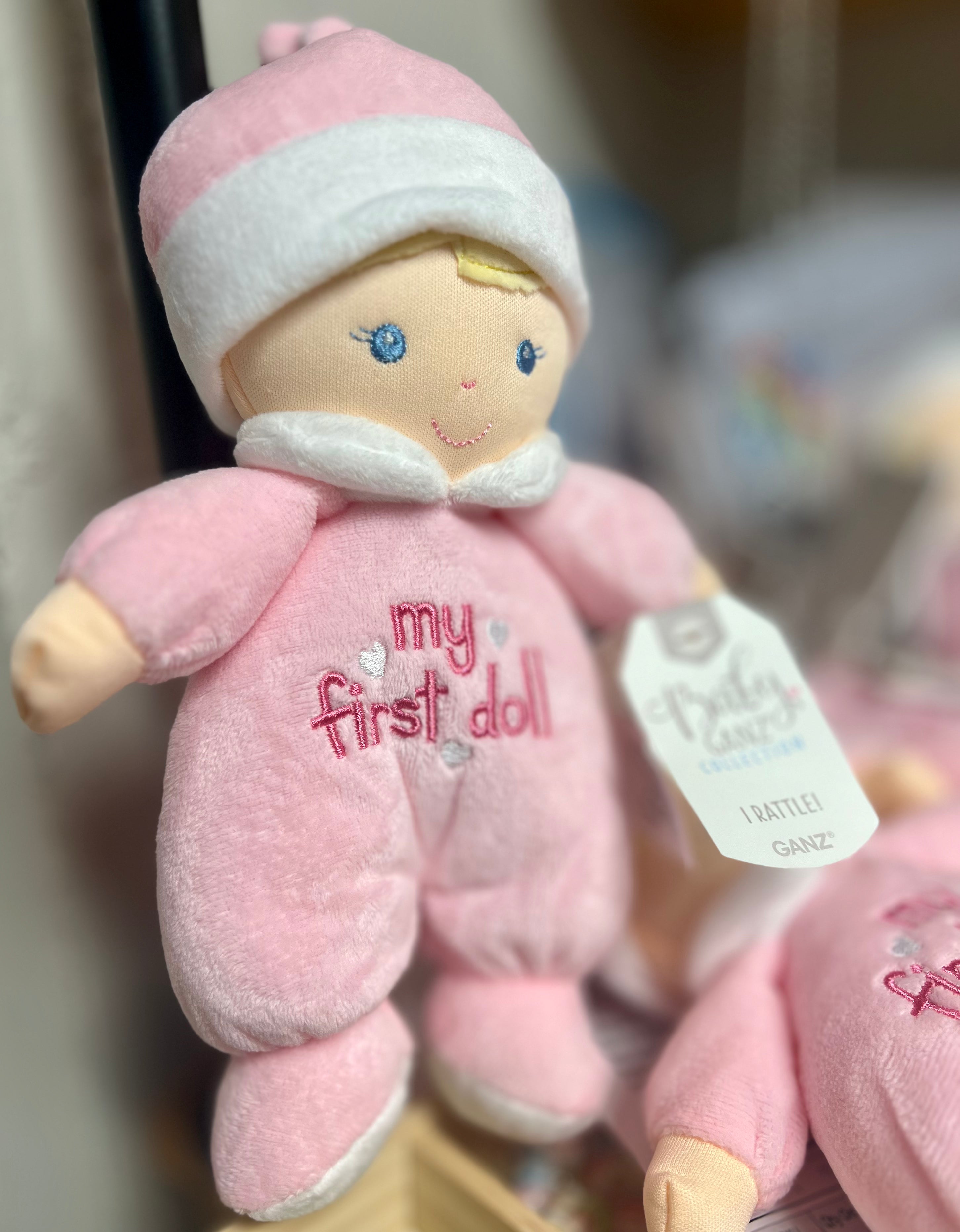 Introduce your little one to her very own baby doll. This soft and cuddly plush doll features a cute pink outfit, and even rattles. Shake the doll and you will hear a cute rattling sound in the belly. Babies love to investigate soft surfaces and enchanting sounds. Your little girl may enjoy carrying this doll around and listening to the rattling noise while she rides along in the stroller or car seat. The belly of the doll is stitched with the message: my first doll, creating a lasting memory of the very first doll she received. This plush figure makes a great gift for baby showers and birthdays.
