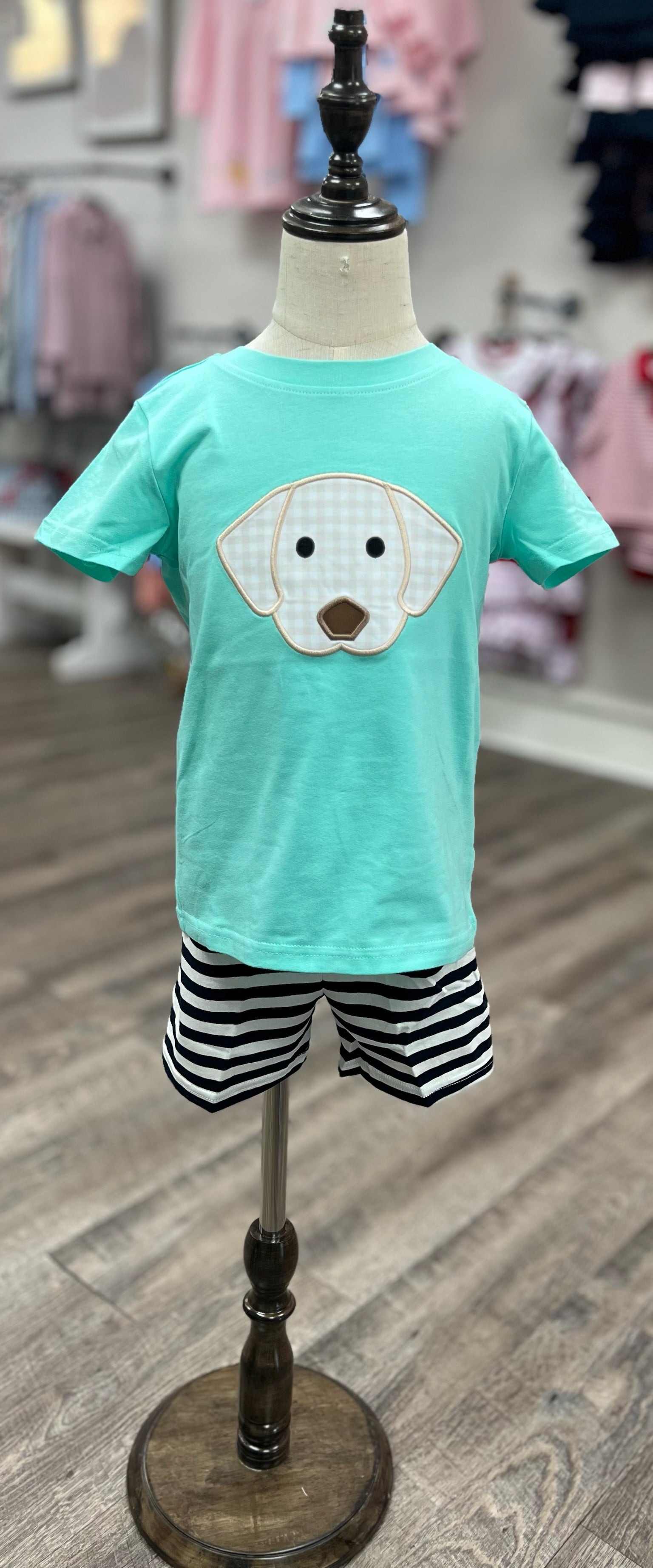 Boy: features a gingham puppy applique on a mint green tee and comfy striped navy and white shorts. Perfect for playdates and everyday wear, this set will keep your little ones looking stylish and feeling comfortable.