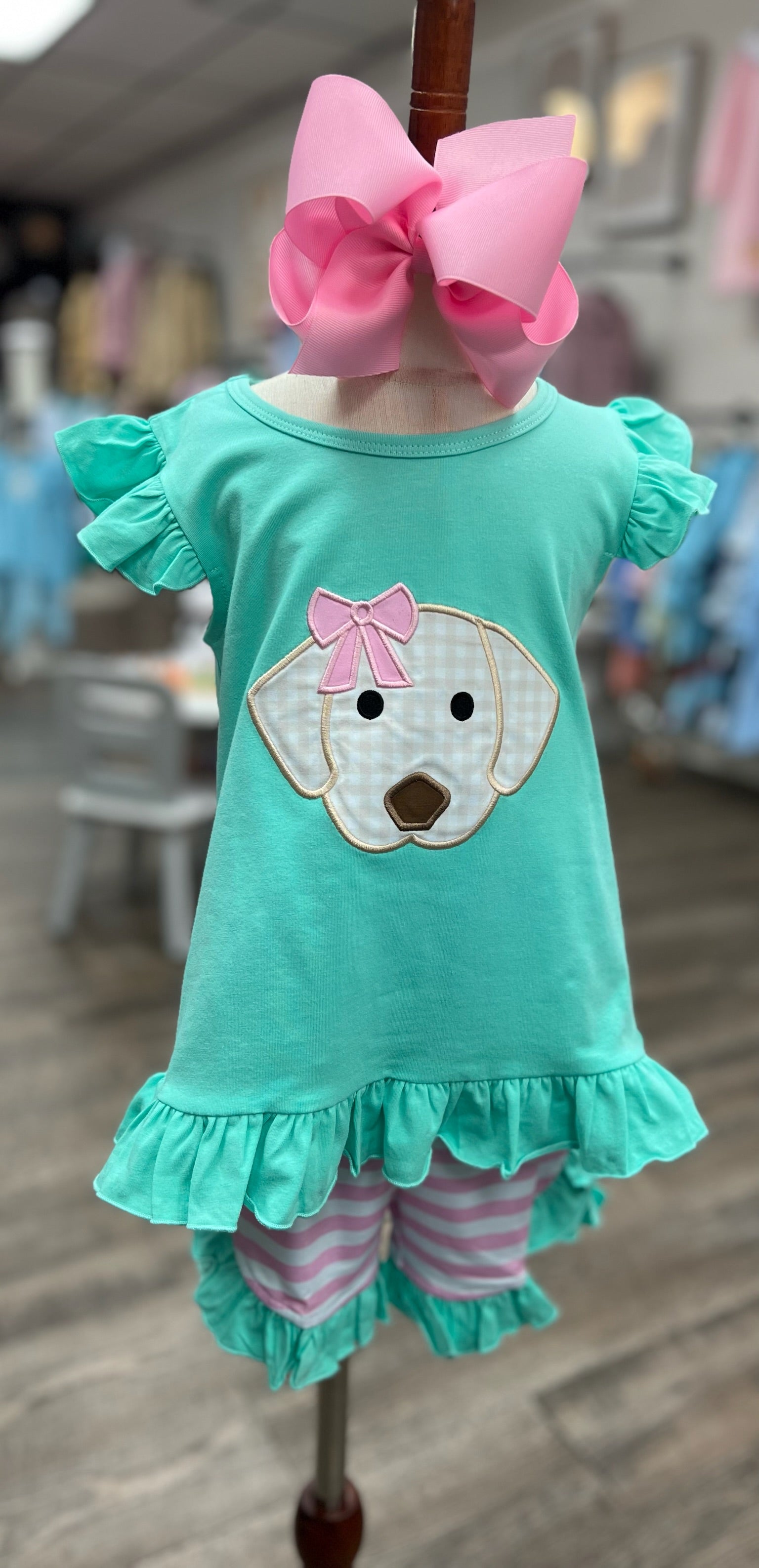 Girl: features a gingham puppy with a pink bow applique' on a mint green ruffle sleeve tee with pink and white ruffled shorts.