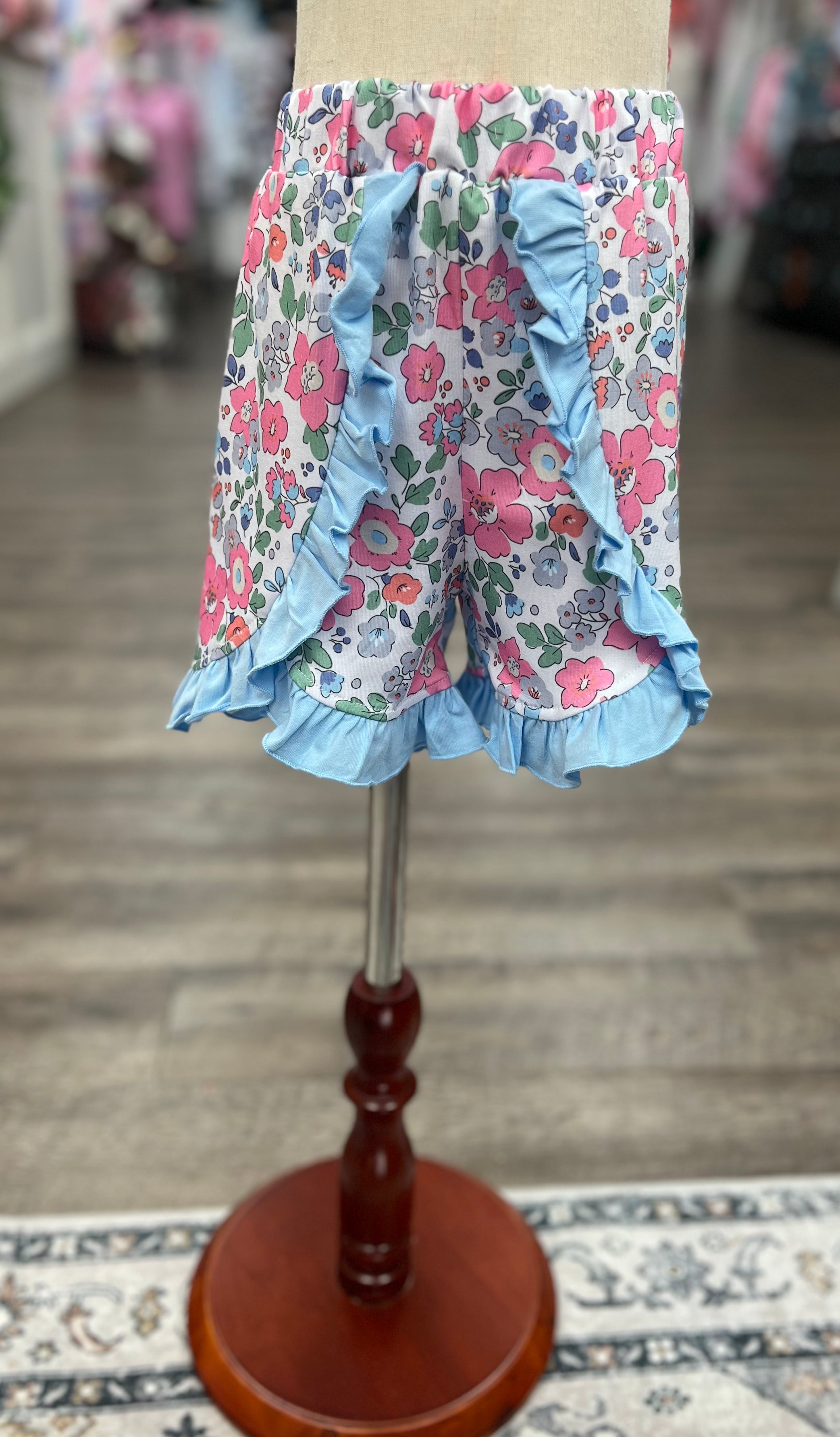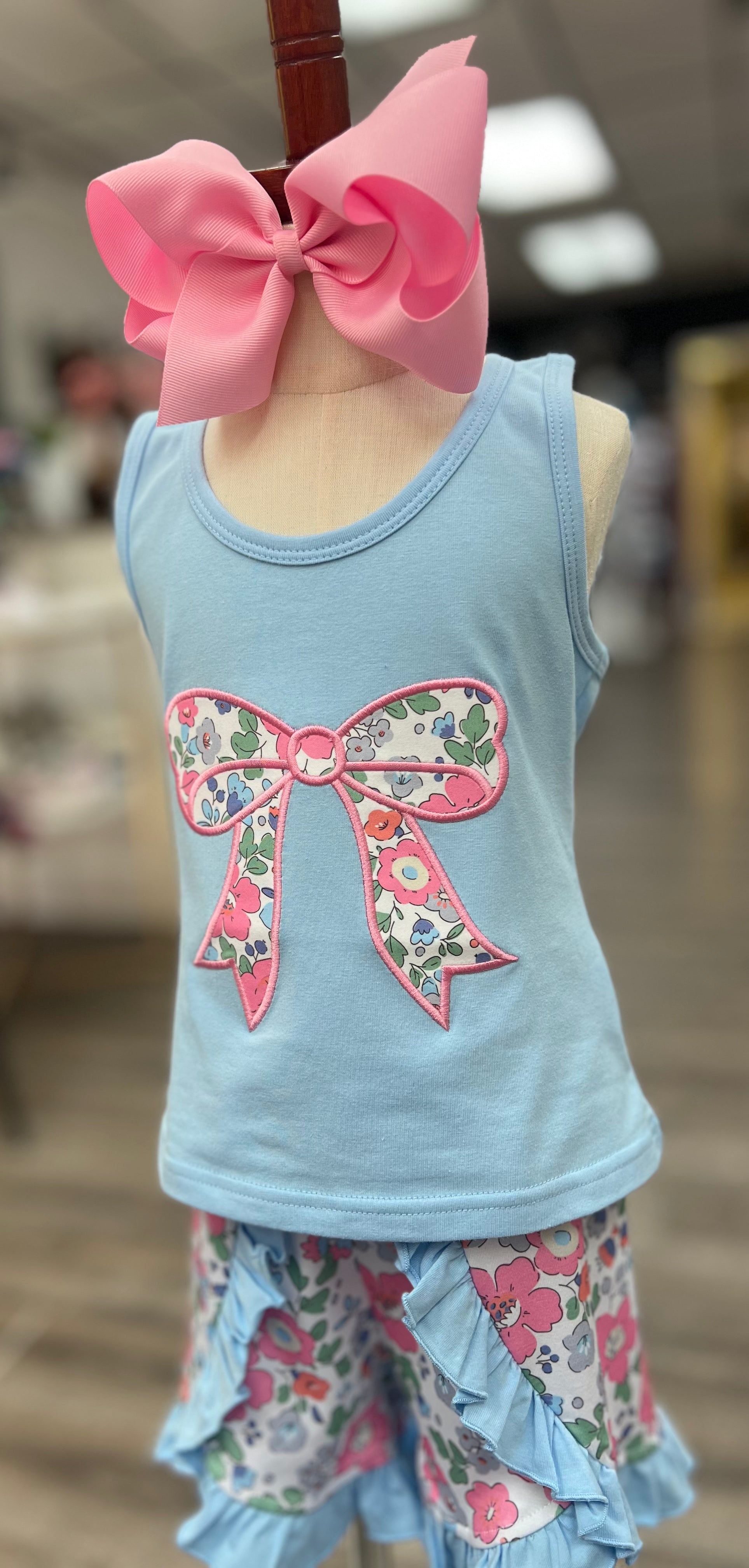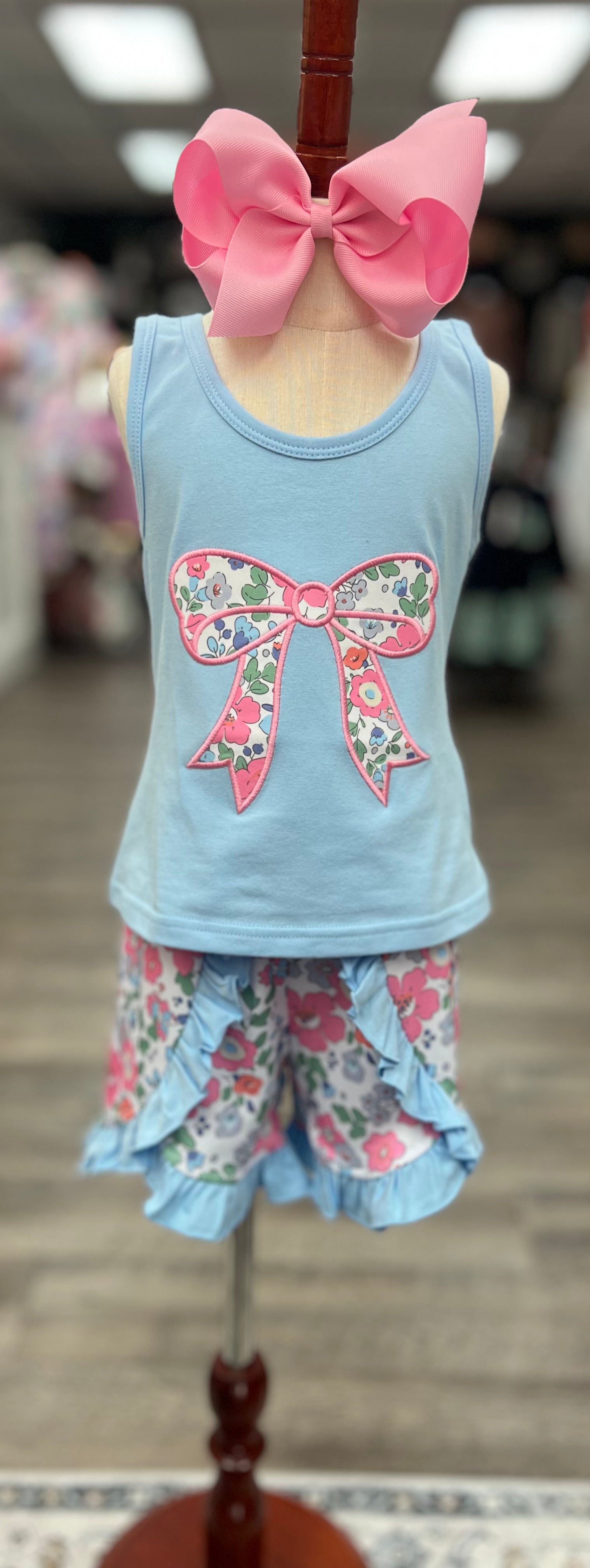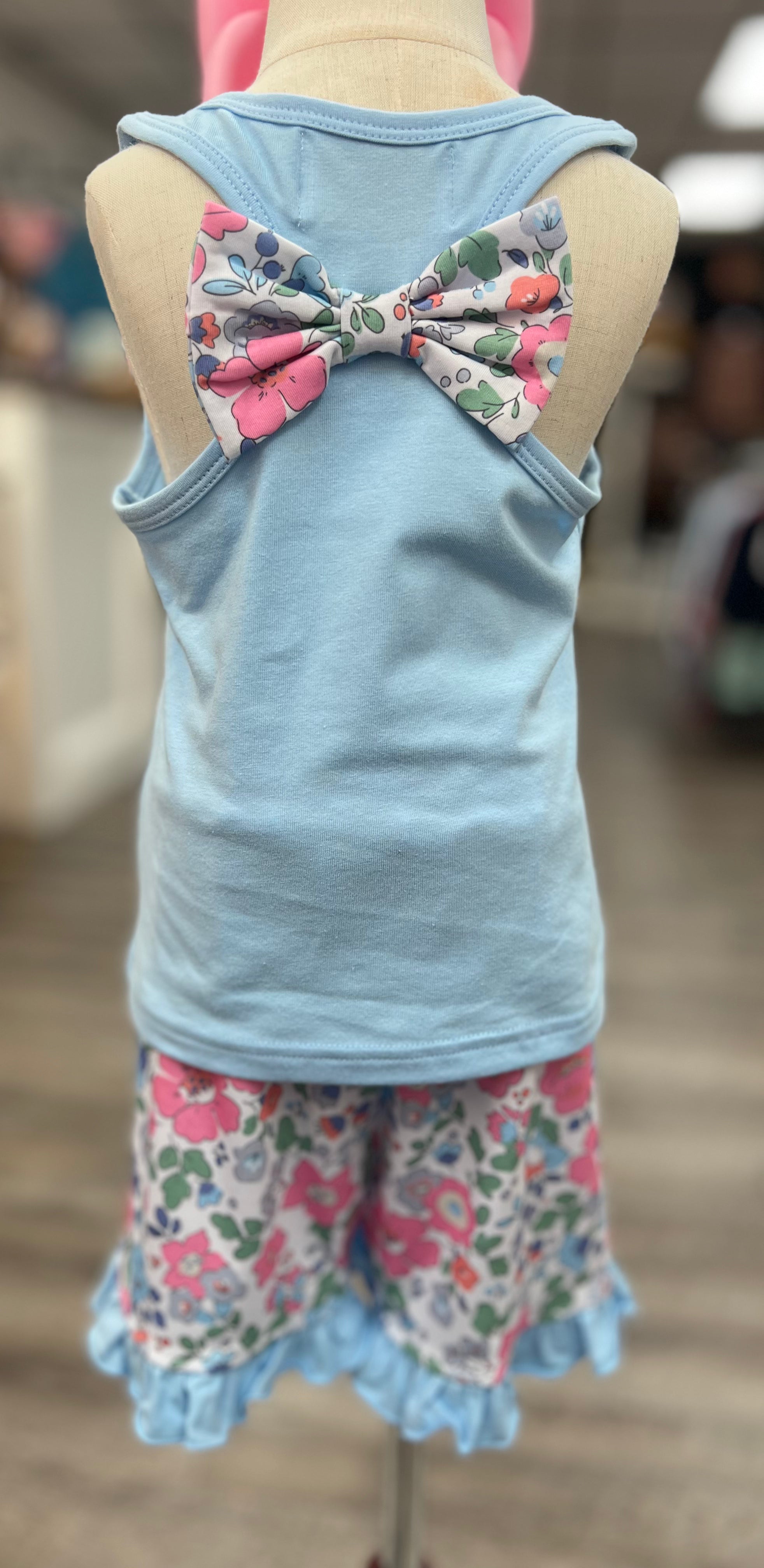 Get ready to feel blessed and beautiful in this playful, light blue, knit, razorback tank! Featuring a unique floral bow in the middle of the back and floral bow applique on the front. This tank is the perfect balance of fun and sass. Complete the look with the matching floral print shorts, featuring a cute blue ruffle trim. So cute you'll want your little girl to wear it every day!