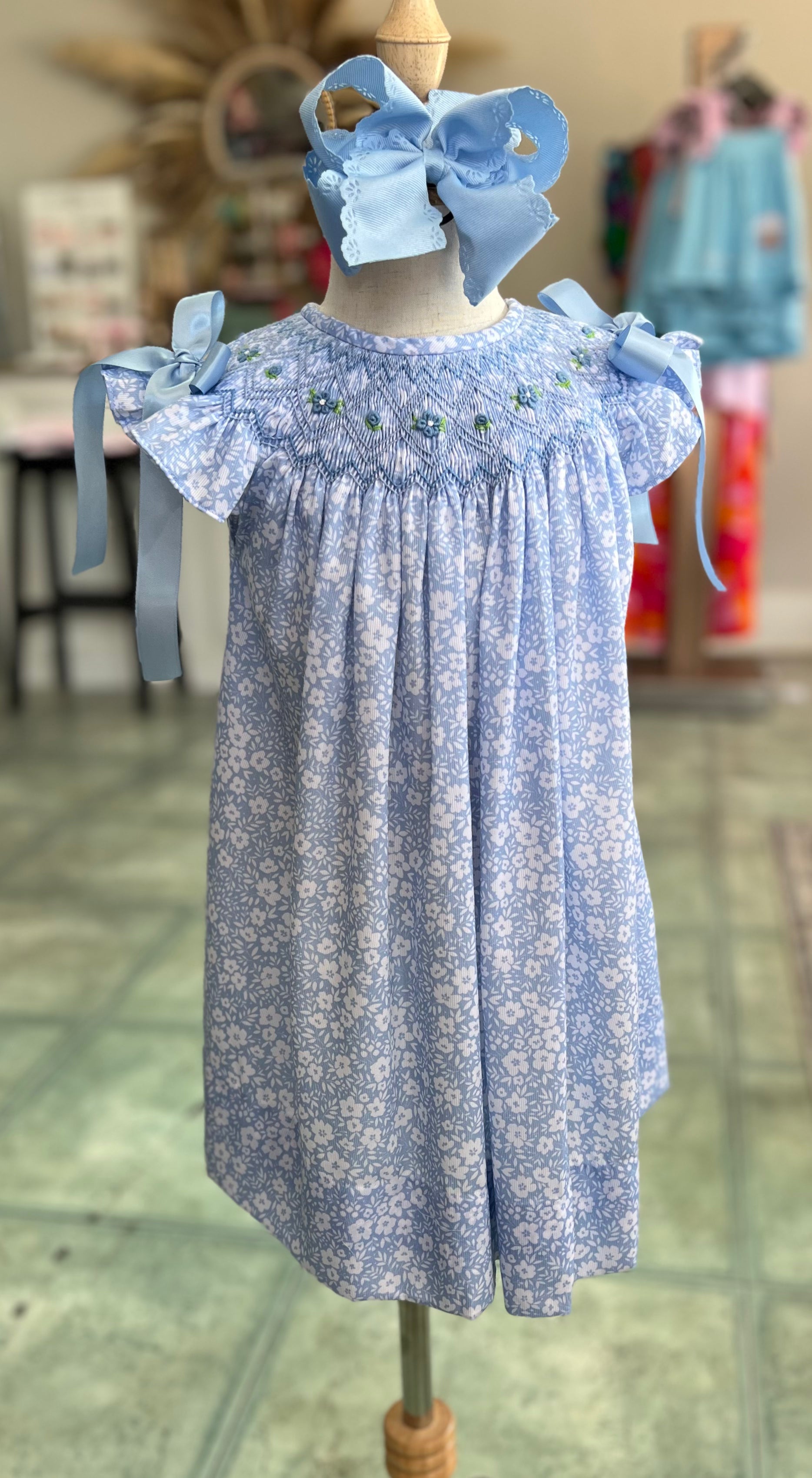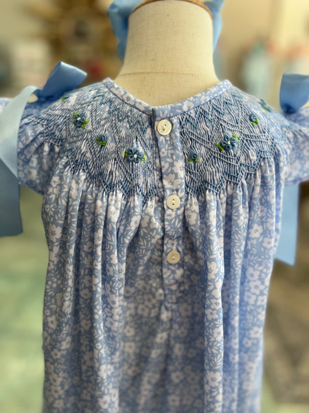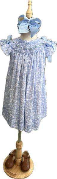 A breath of fresh air wrapped in soft florals and southern charm. This timeless smocked dress is crafted in a beautiful sky-blue floral print with hand-stitched embroidery and sweet satin bows at each flutter sleeve.