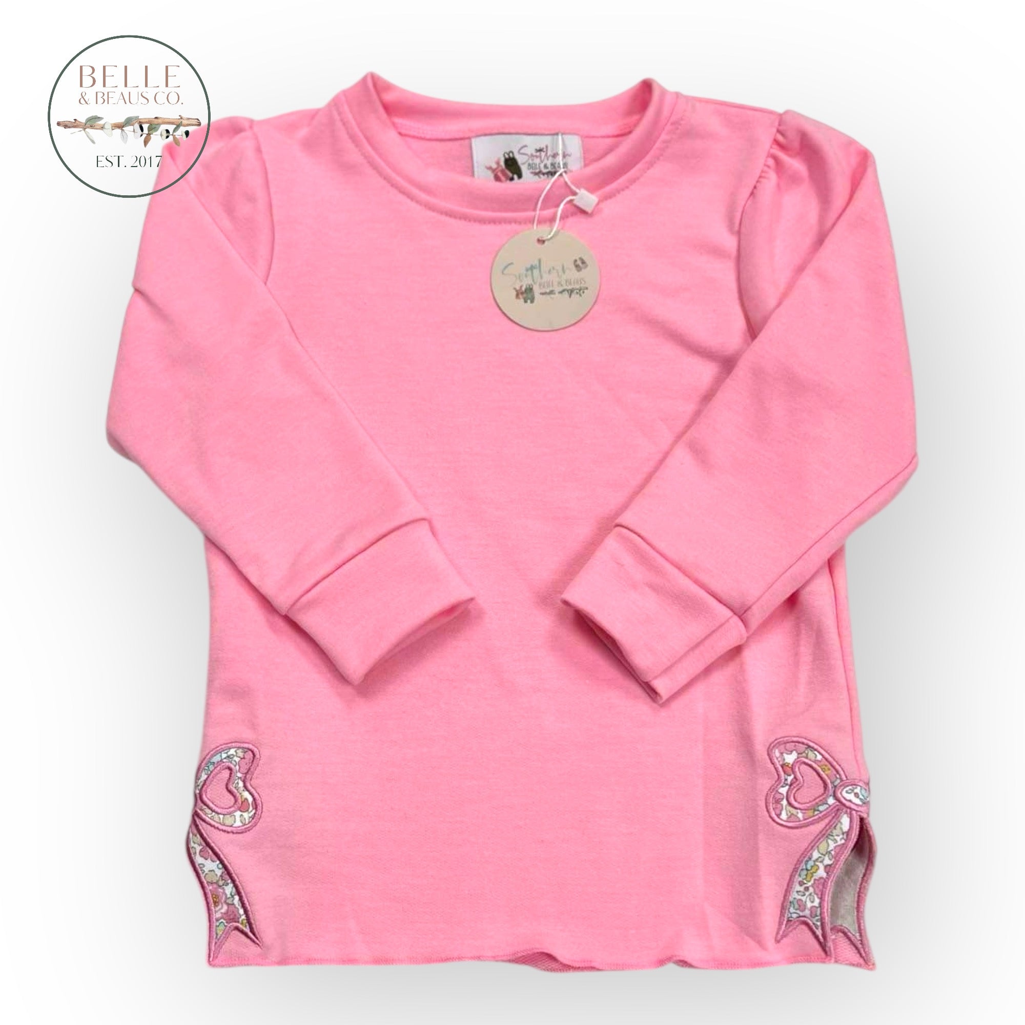 Add a playful twist to your wardrobe with our Bowtiful Pullover! This quirky top features a raw hem and a fun bow appliqué on the side hem. Stay on-trend and make a statement with this unique piece. (Bows not included, just kidding!)