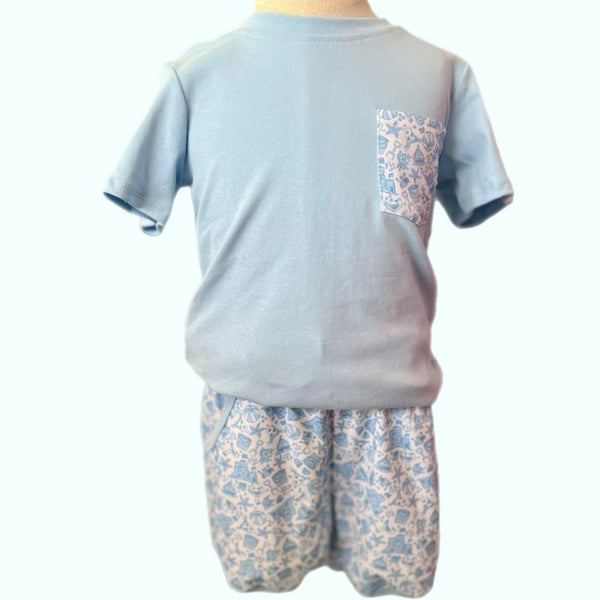 Easy, breezy, and ready for beach adventures — this comfy boys' set includes a soft sky-blue tee with matching printed pocket, plus elastic-waist shorts in our signature coastal print. Mix, match, and play all day!