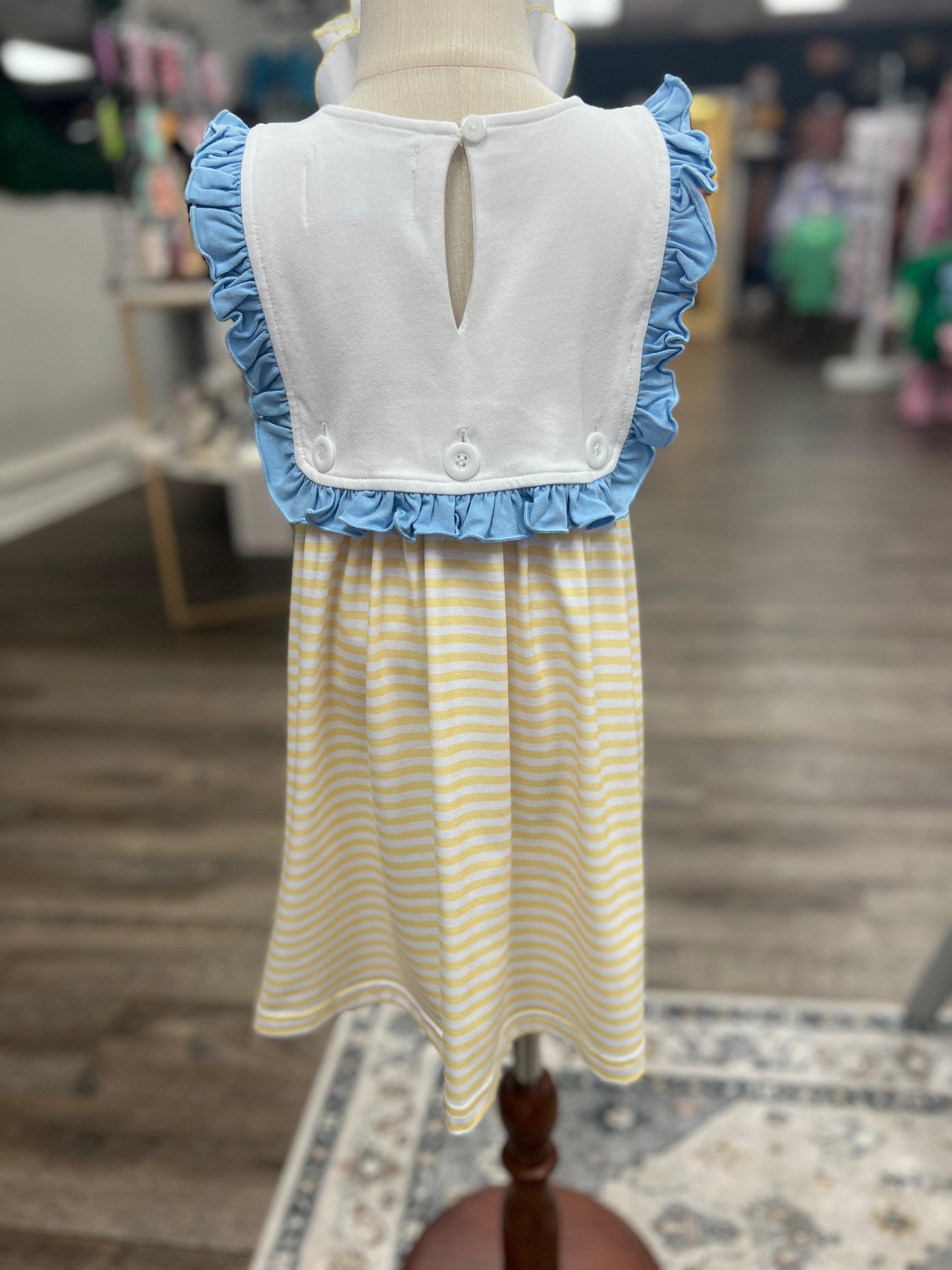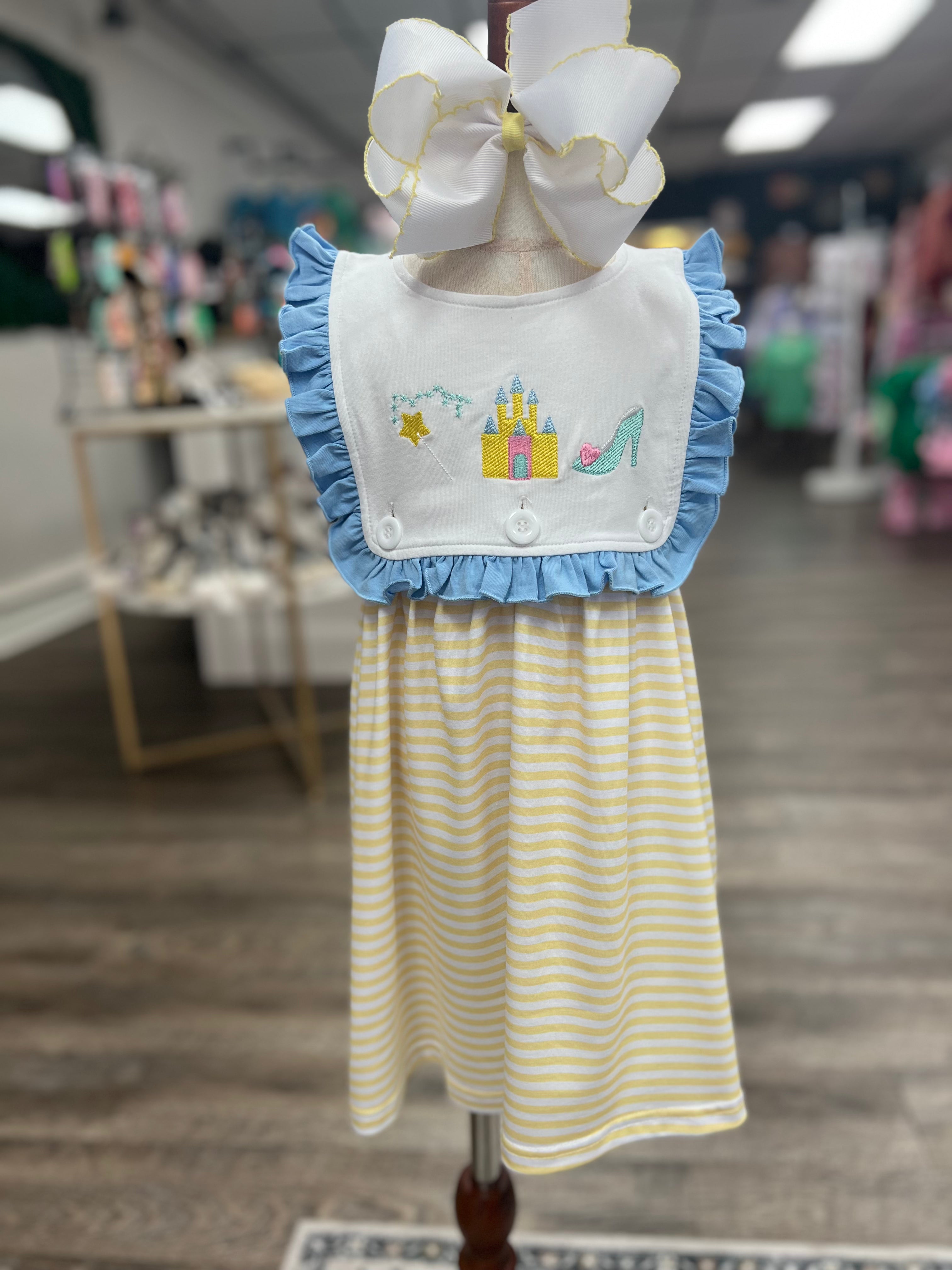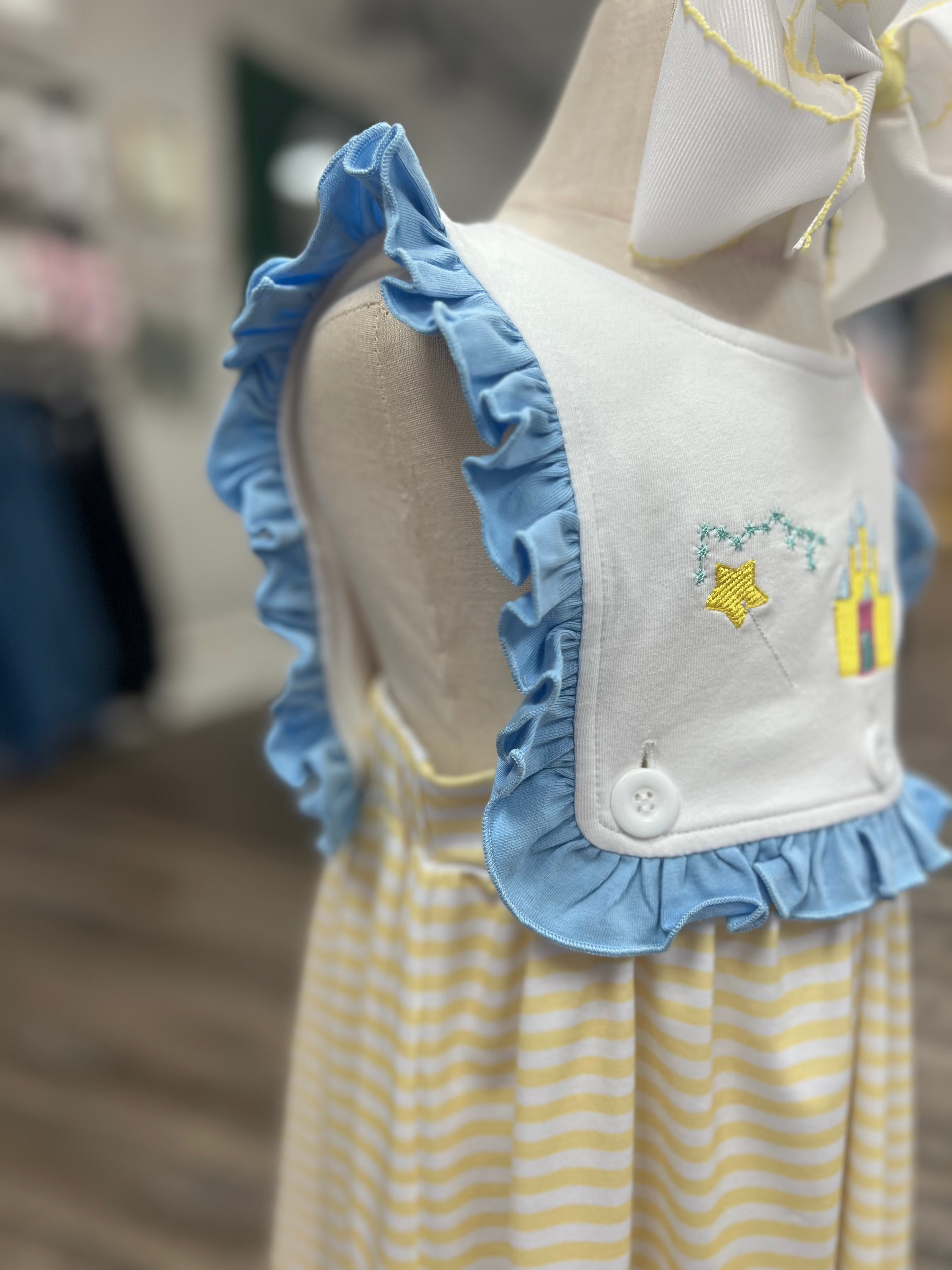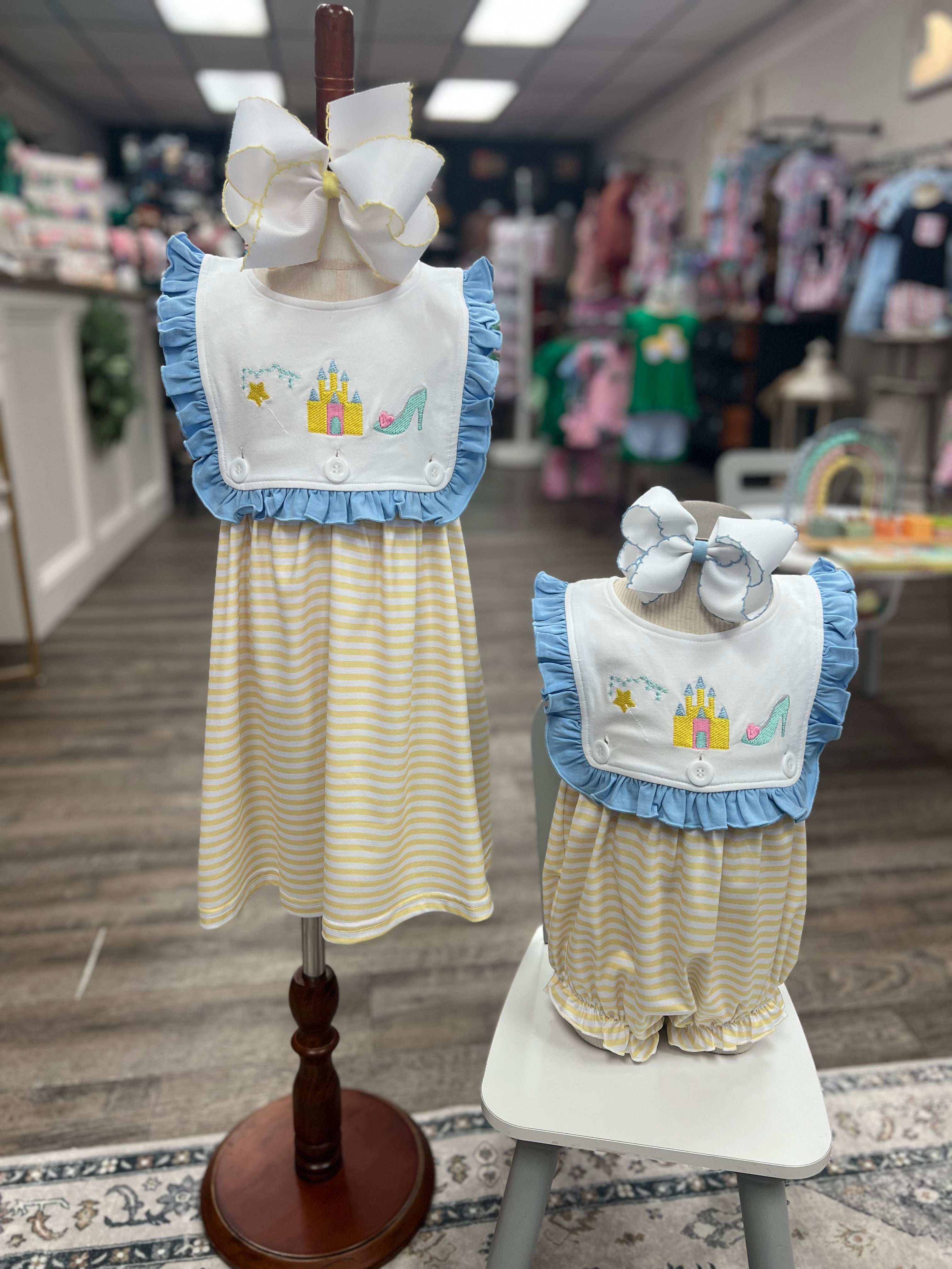 Be the belle of the ball in our Clock Strikes 12 dress. This Cinderella themed sleeveless knit dress features a magic wand, castle, and glass slipper applique for added enchantment. The removable bib, trimmed in blue ruffles, adds a touch of whimsy. Complete the look with our matching sister bubble.