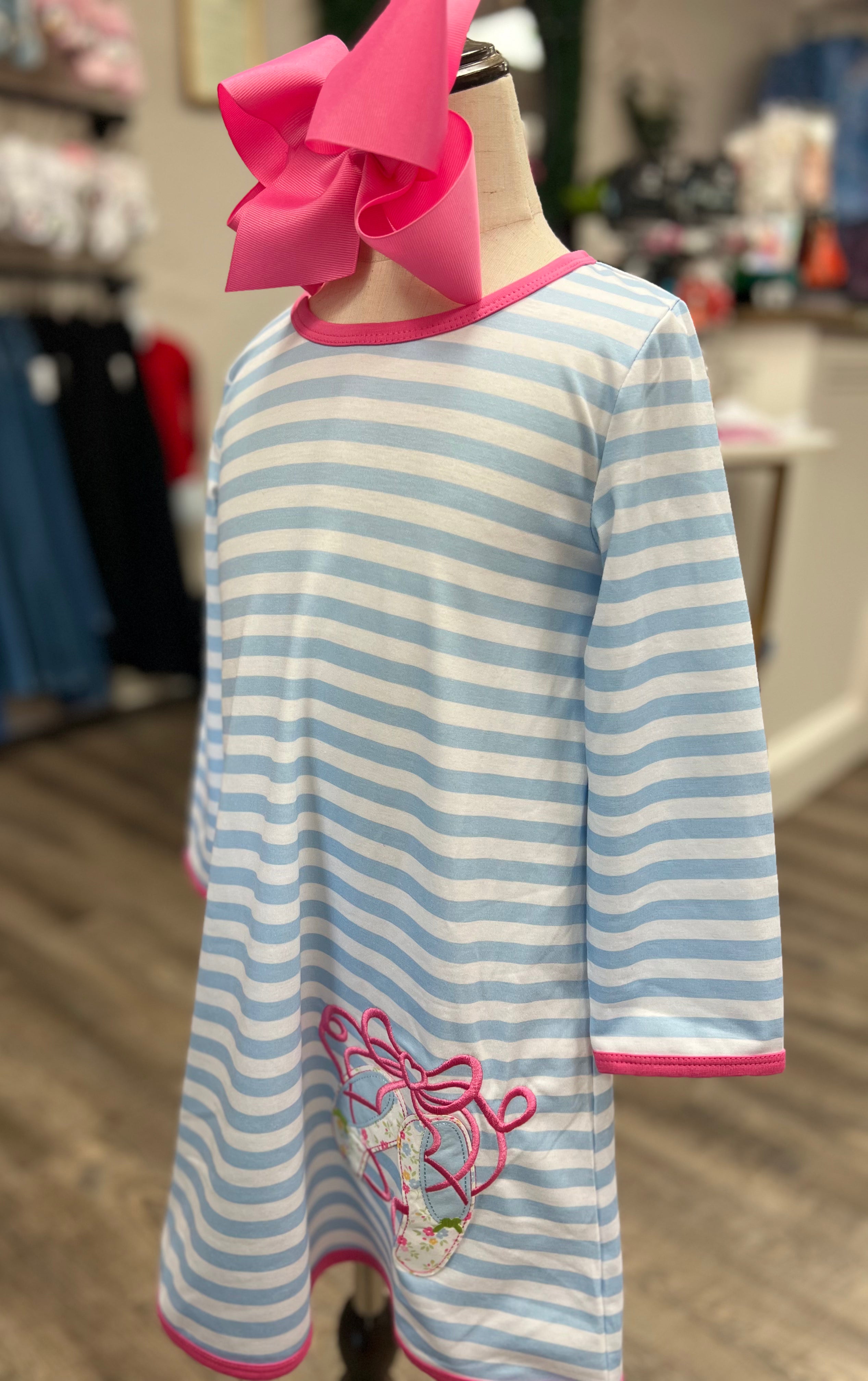 This sweet little dress is perfect for every budding ballerina. Designed in soft sky-blue and white stripes with playful hot pink trim at the neckline, cuffs, and hem, it’s both comfortable and cute. The highlight is the embroidered ballet slipper appliqué with dainty floral details and a pink bow—adding the perfect touch of girly charm. With its ¾ sleeves and cozy knit fabric, this dress is ideal for playdates, school, or twirling around the living room.