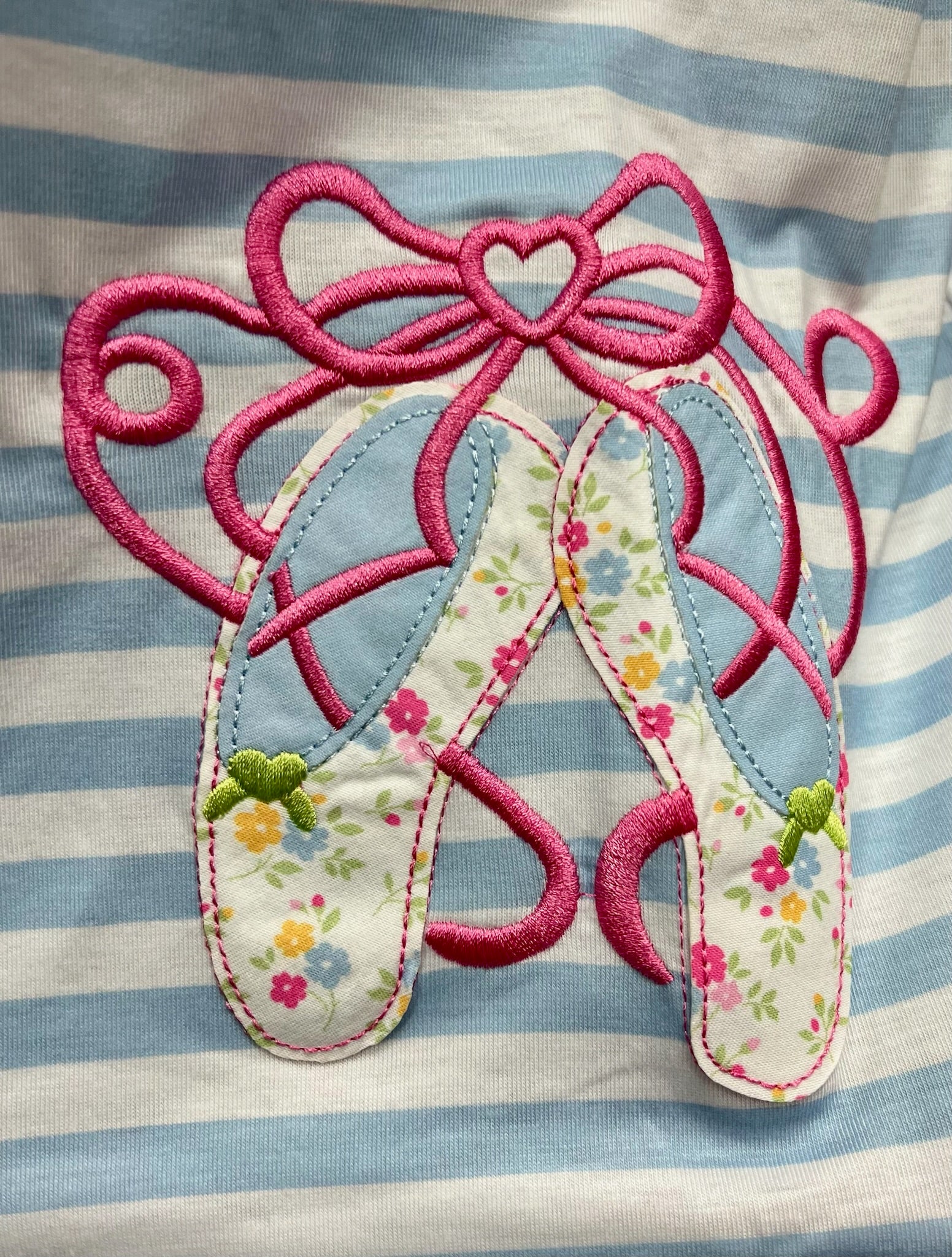 Adorable embroidered ballet slippers appliqué with floral detail and pink bow