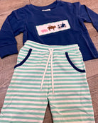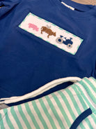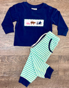 Get ready for a day on the farm with our Farm Days Smock Jogger! This navy long sleeve smock shirt features charming hand-embroidered designs of a pig, cow, chicken, and tractor. Plus, the teal and white striped drawstring joggers with pockets provide both comfort and style. Experience the farm life in style and convenience.