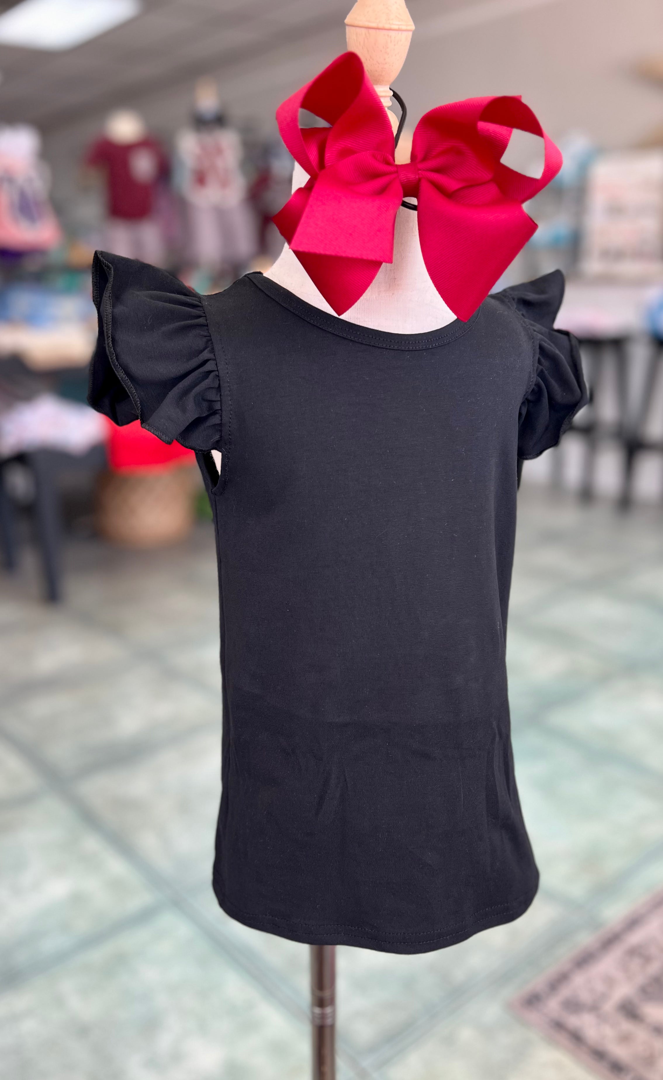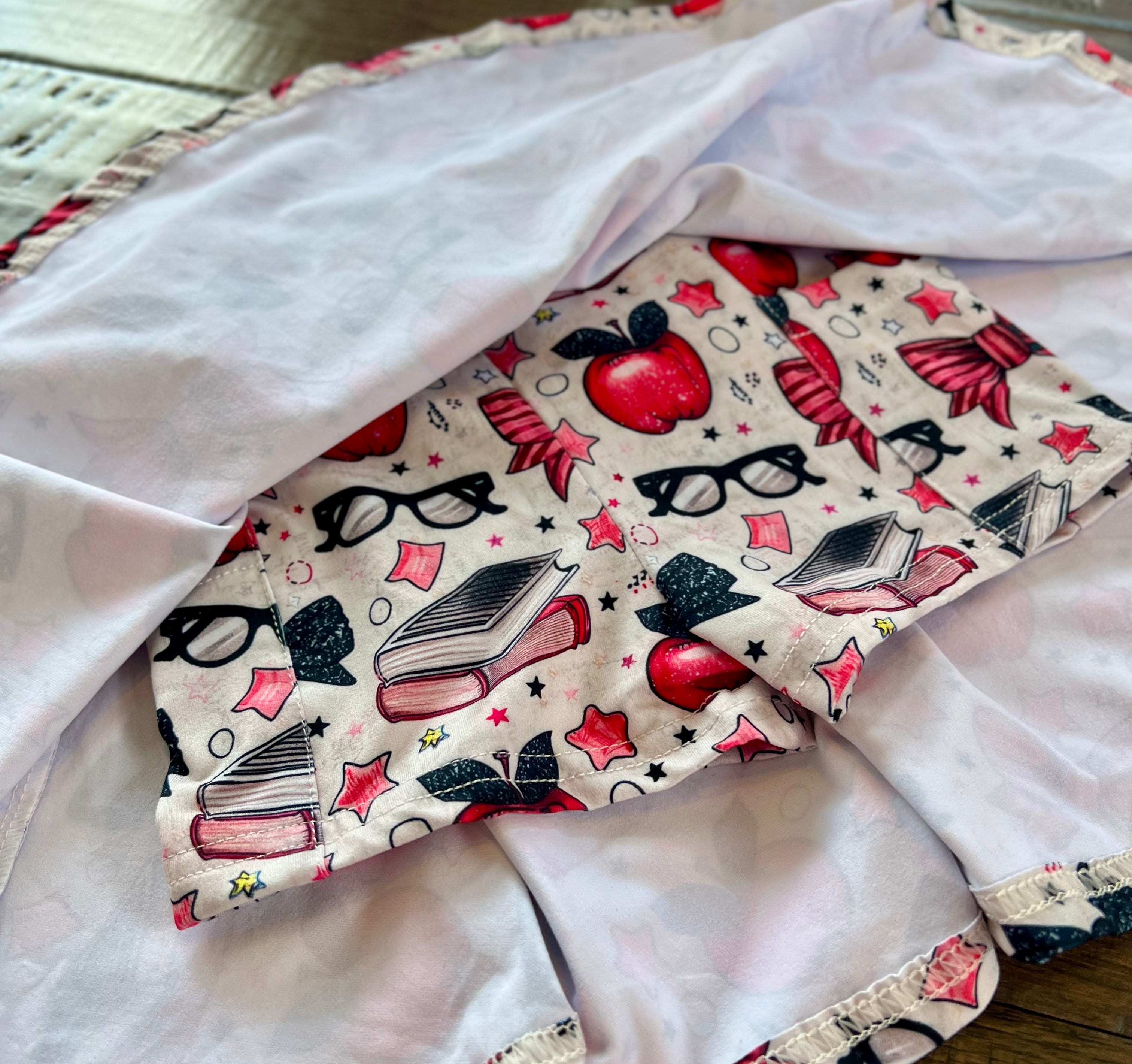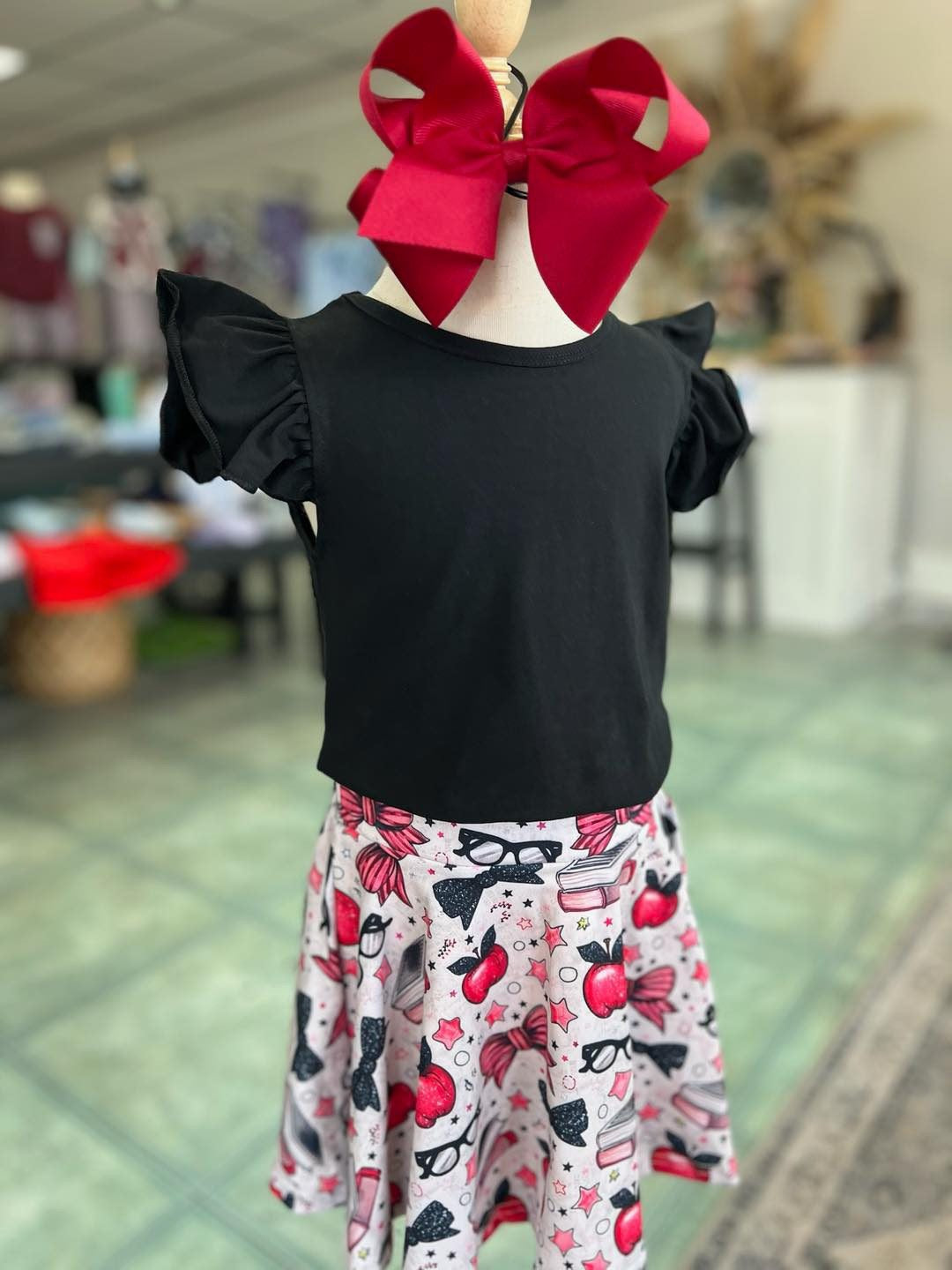 This girls’ set includes a flutter sleeve black top and a twirl-worthy skirt featuring playful prints of apples, books, bows, and stars — made for classroom cuties and confident first-day moments.