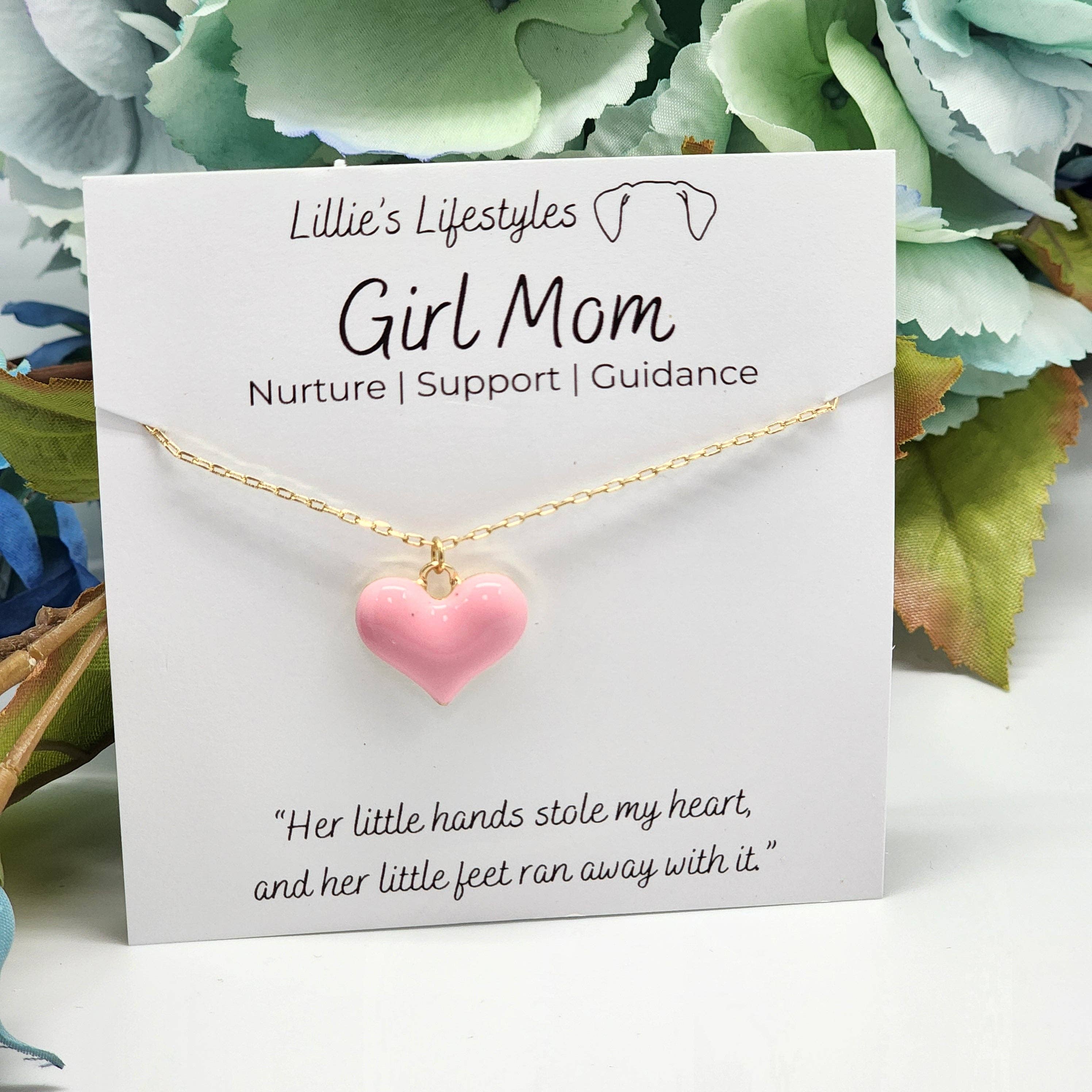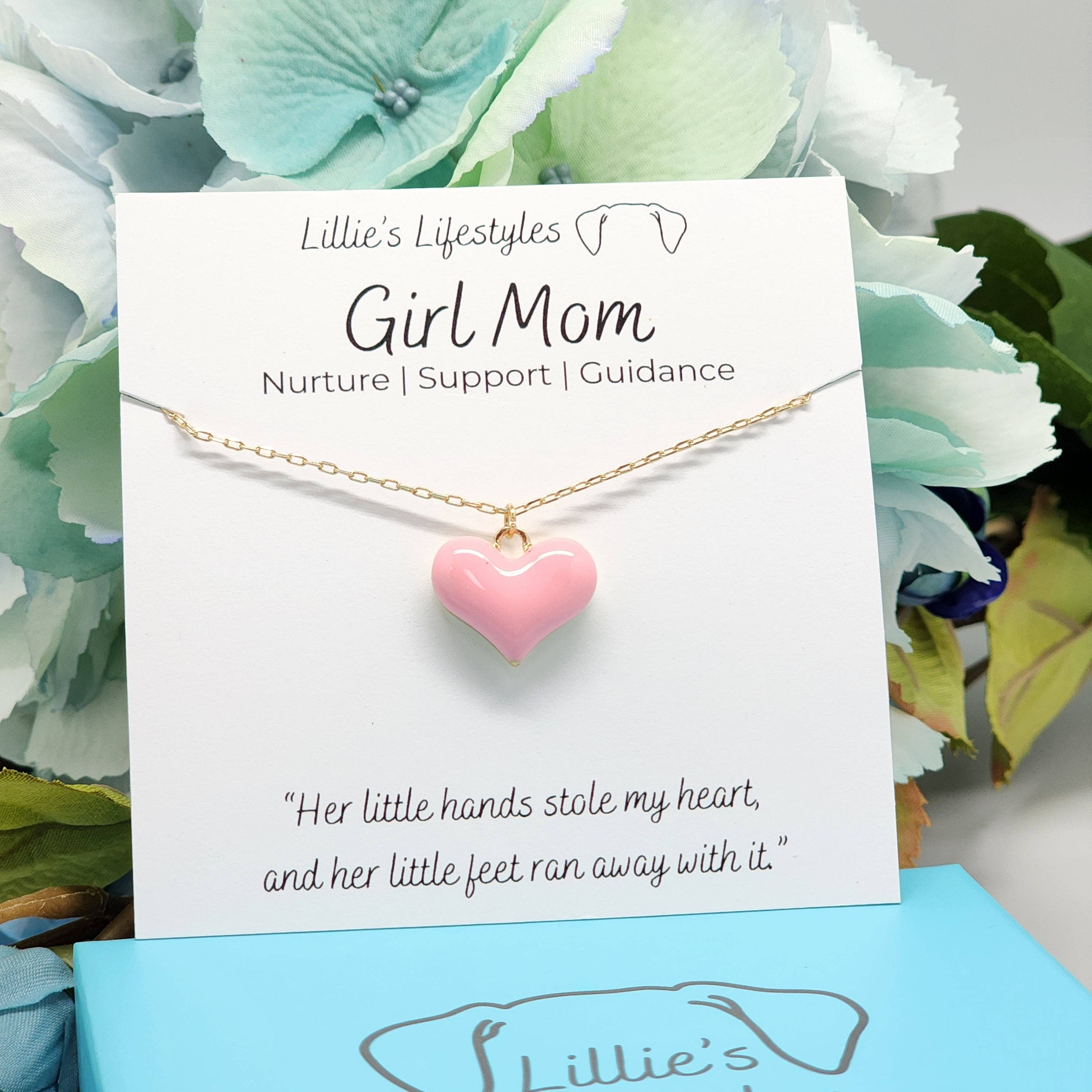 The Girl Mom necklace from Lillie's Lifestyles features a pink puffy heart to represent the blessing of a daughter. The Girl Mom pendant represents Nurture Support and Guidance. “Her little hands stole my heart,