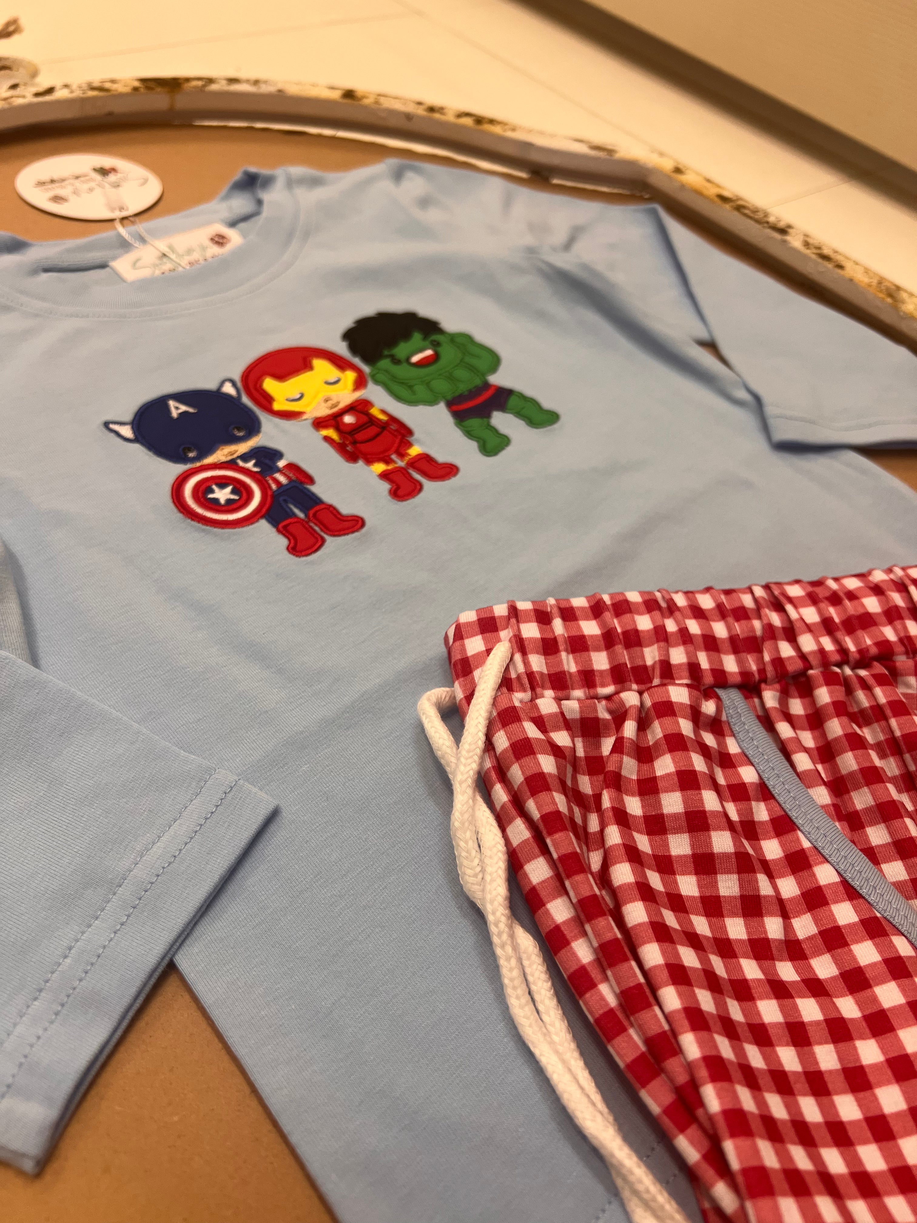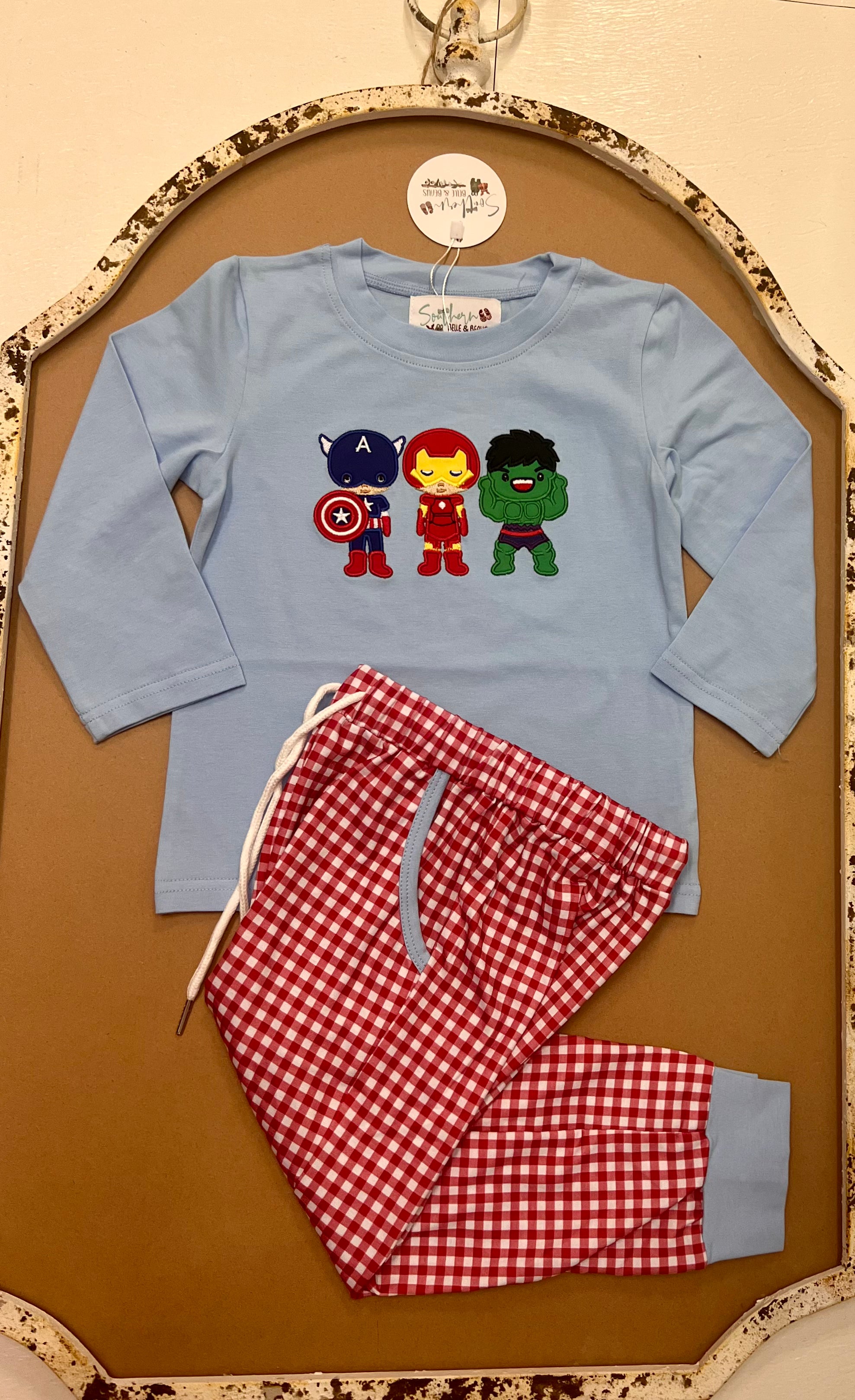 Everyday adventures just got a whole lot cooler! Our Hero Hustle Jogger Set is made for little boys who never slow down. This two-piece outfit features a sky-blue long sleeve top with playful superhero characters and matching jogger-style pants with red gingham print. With real pockets, a working drawstring, and a comfy elastic waistband, this set is perfect for playdates, Walmart runs, preschool days, or just being the hero of the backyard.