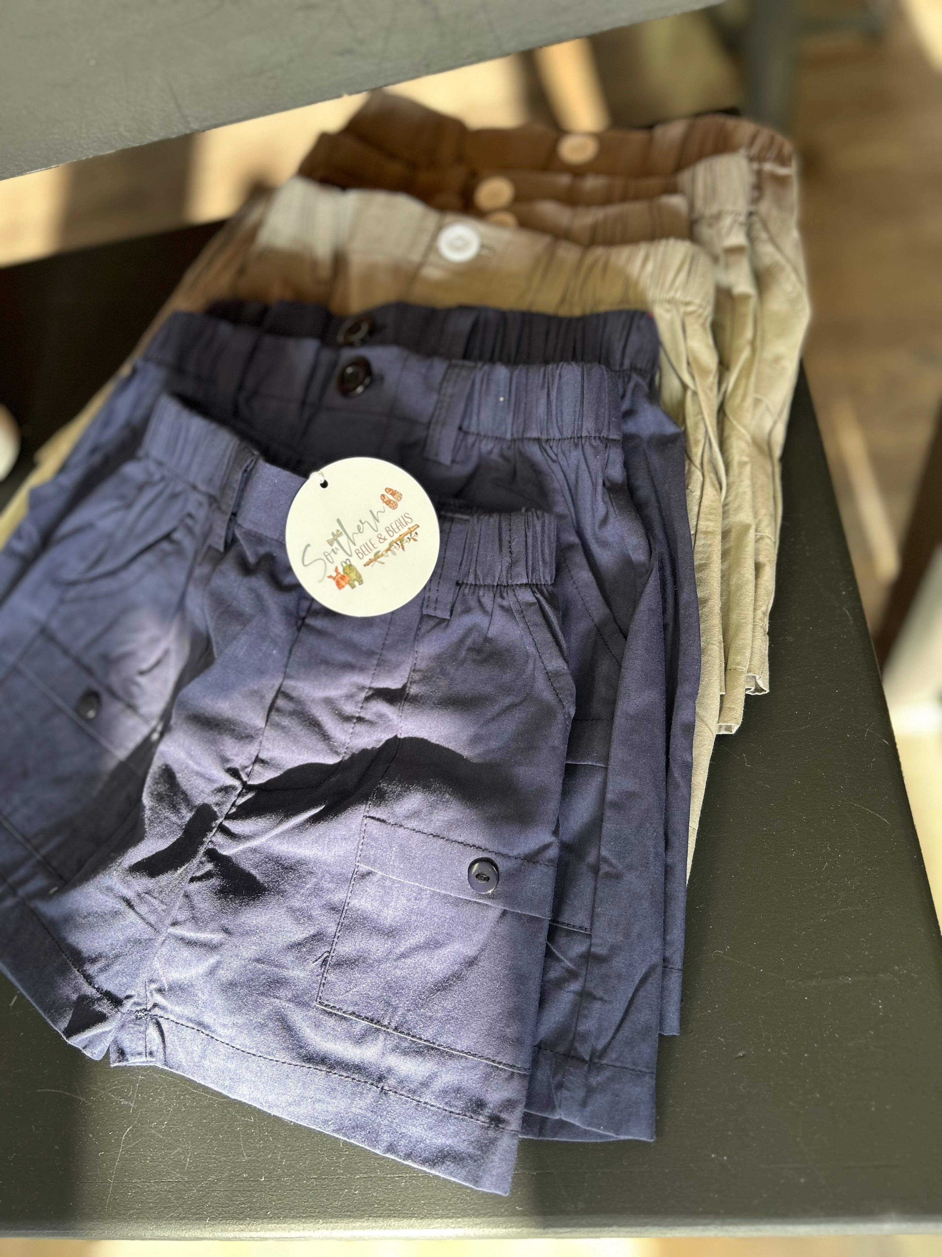 Unleash your little boy's adventurous side with our Khaki Cargo Shorts. Made with a woven fabric for durability, these shorts feature an elastic waist and belt loops for a comfortable fit. Perfect for all their outdoor escapades! (Siblings not included).